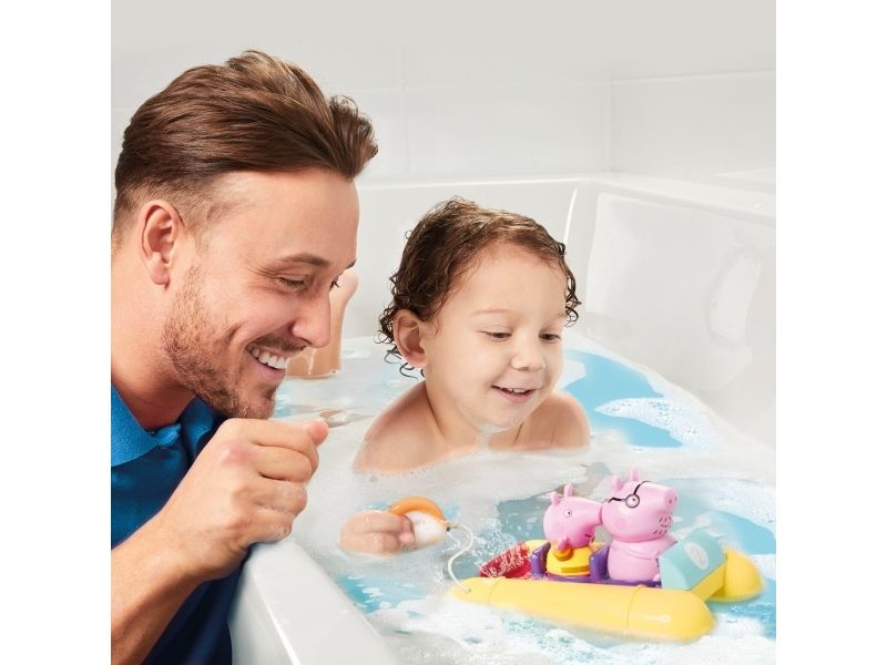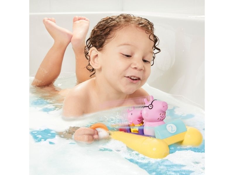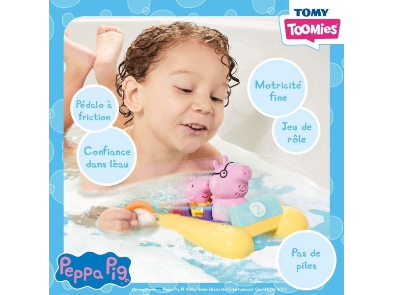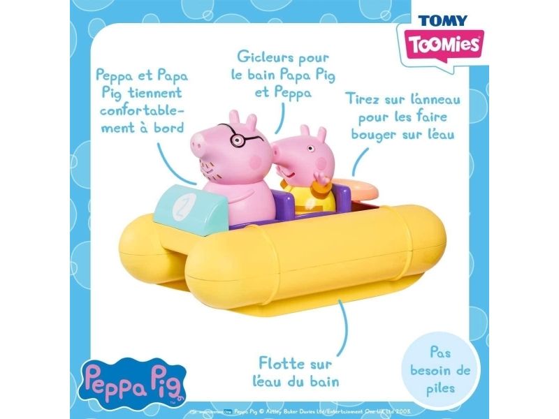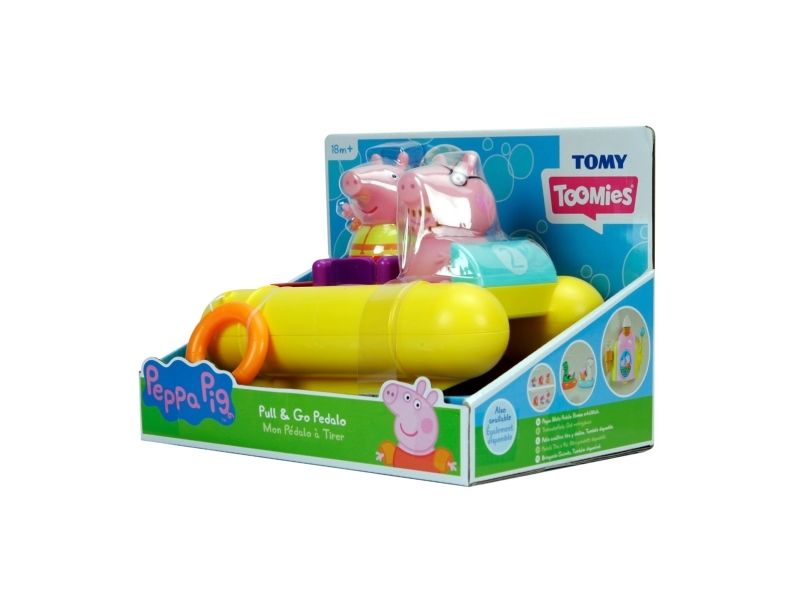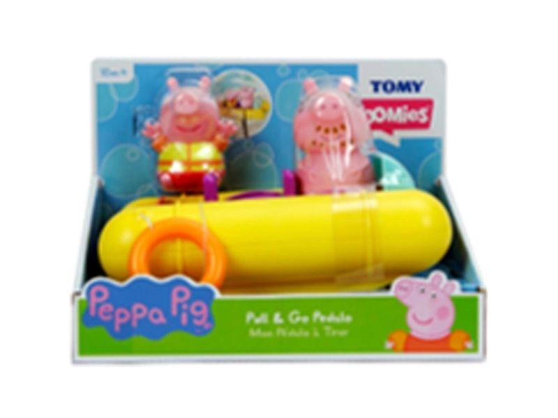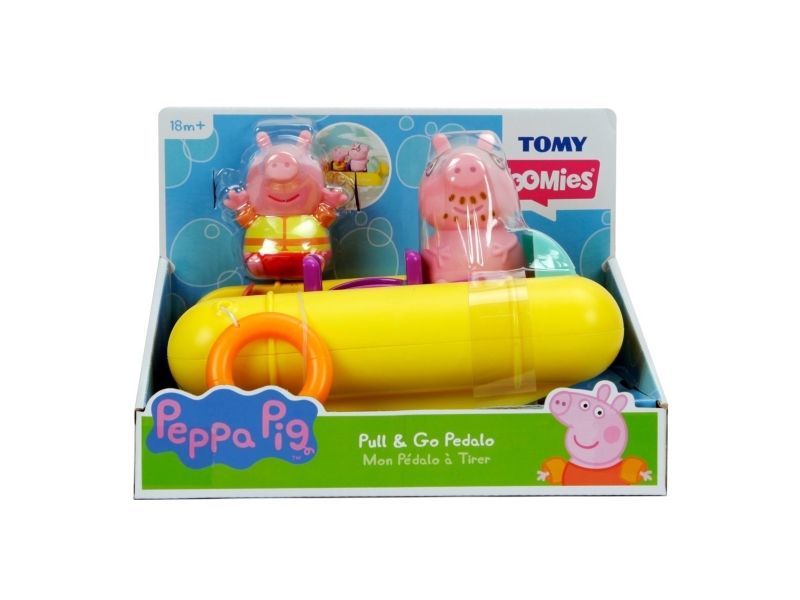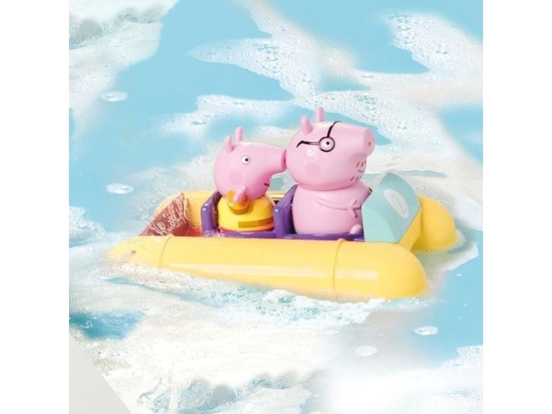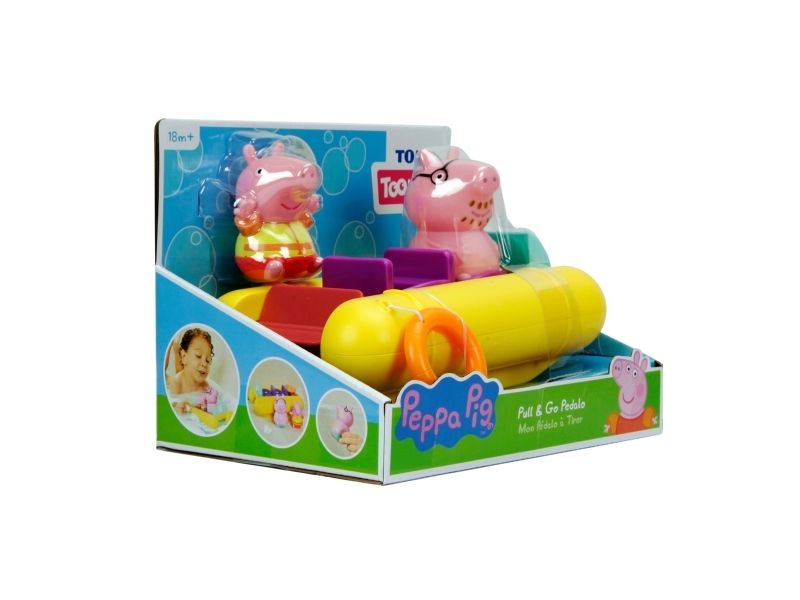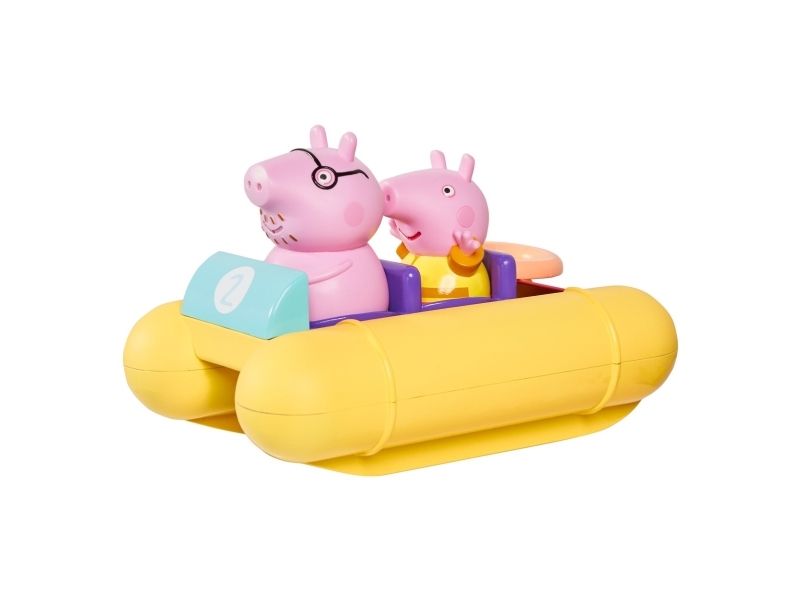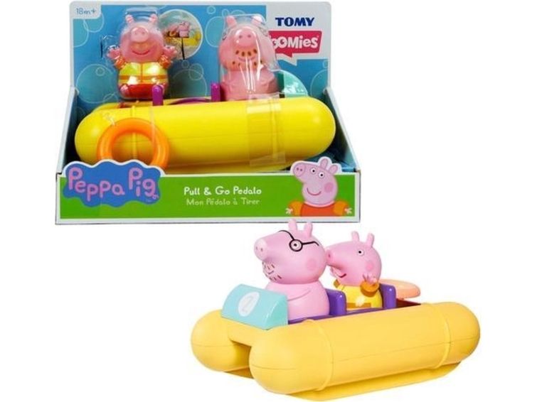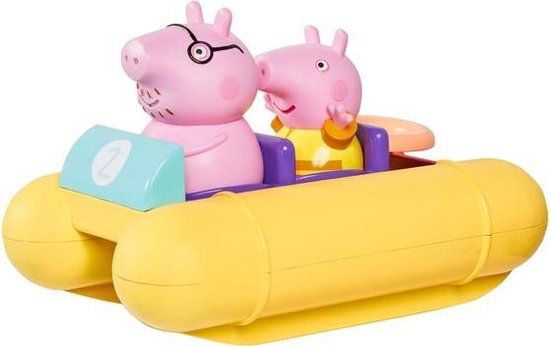Bortsett fra å hoppe i sølete sølepytter, elsker Peppa Gris og Pappa Gris ingenting bedre enn å komme seg ut på vannet for et pedaleventyr. Dette fargerike settet inkluderer de to figurene og håndverket deres med sin enkle, men geniale ""motor"". pedalen er en flytende gul bøyle designet for små hender. Et forsiktig trekk er alt den trenger for å trekke ut strengen. Slipp den og pedalen legger ut på ferden, sammen med et sett med fjærbelastede roterende årer.