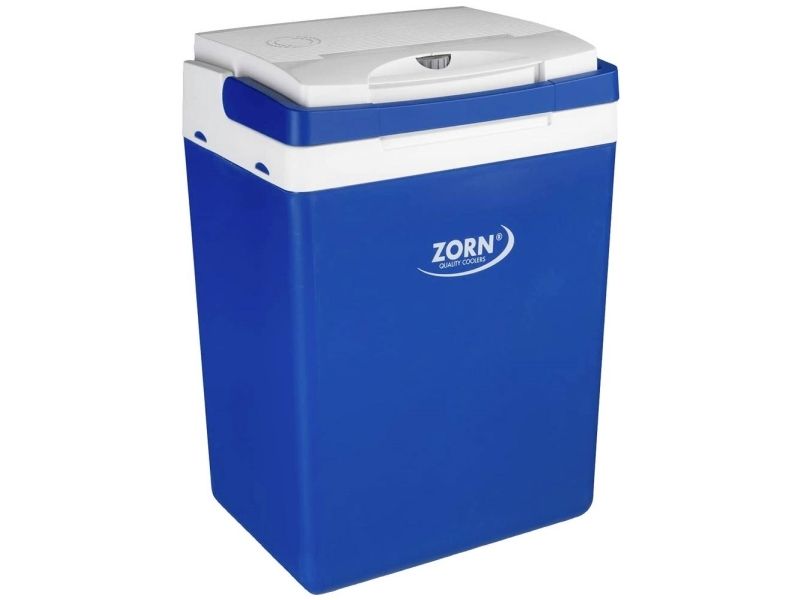 ZORN 30 liters elektrisk køleboks 12/230V - blå ZORN Z32 elektrisk køleboks/køletaske med en kapacitet på 30 liter og kan tilsluttes både 12 volt og 230 volt strømforsyning. Dette gør den velegnet til som køleboks til bil eller campingvognen, samt når den er tilsluttet en almindelig stikkontakt. Boksen bruger elektricitet til at køle ned og kan holde en temperatur på op til 17°C under omgivelsestemperaturen. Den er udstyret med en termostat, der gør det muligt at justere temperaturen og energiforbruget ved 230V. Desuden har den et låg, der kan lukkes tæt og holder kølingen inde i boksen. Velegnet til 7x1,5 liter flasker (35 cm stående) eller 1x2 liter flasker (42 cm stående), 36x0,33 L drikkevaredåser.