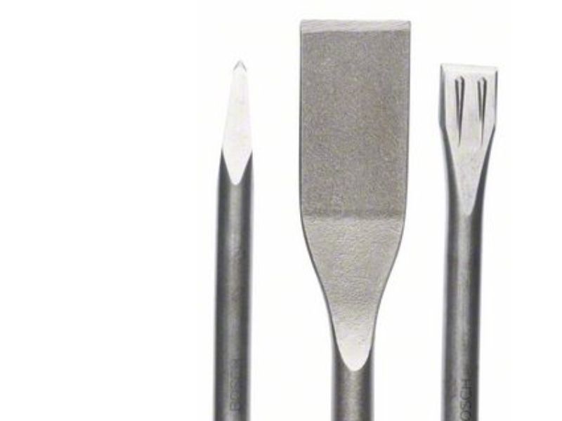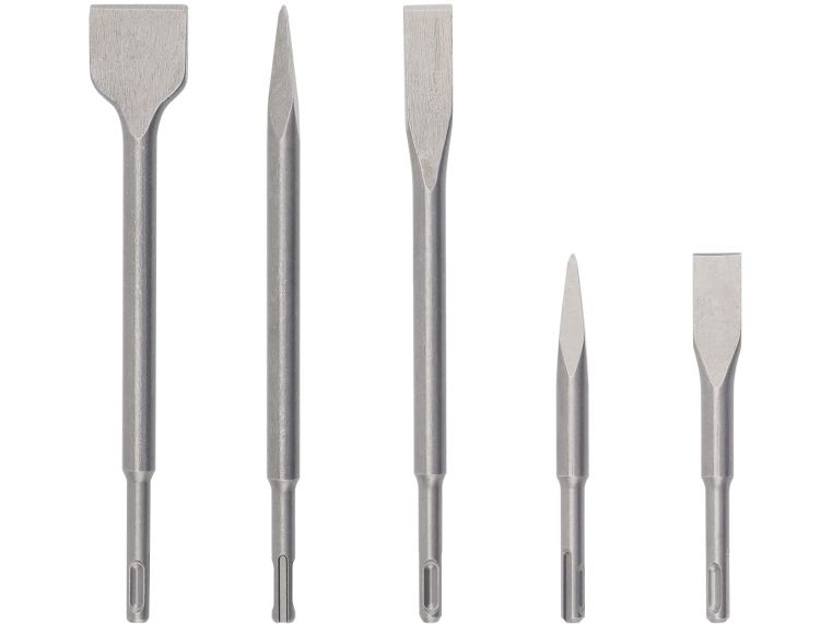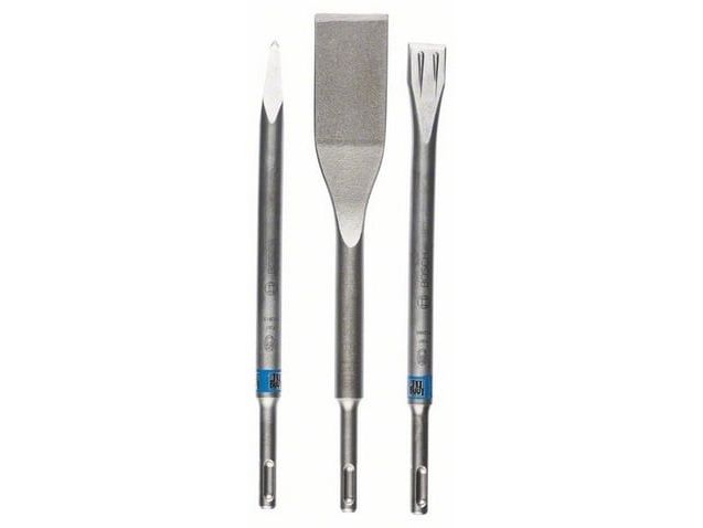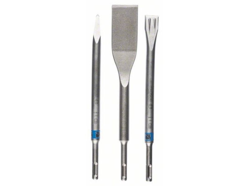 The SDS plus chisel set, 3-piece, offers one flat chisel, pointed chisel and tile chisel for a wide variety of renovating and restoring applications in several materials. All these self-sharpening chisels have been designed to meet the demands of specific materials, providing a high material removal rate and reduced jamming. The flat chisel has power ribs to create both lateral and vertical cracks in concrete. The pointed chisel has a twisted top for a wide material removal footprint and less jamming, while the tile chisel has a flat angled design that allows for the removal of entire tiles without breakage. This set is intended for use in concrete, brick and tiles. The chisels are compatible with SDS plus chisel attachments or they can be used directly in SDS plus hammers with a rotation stop.