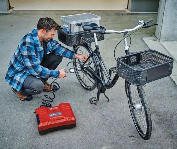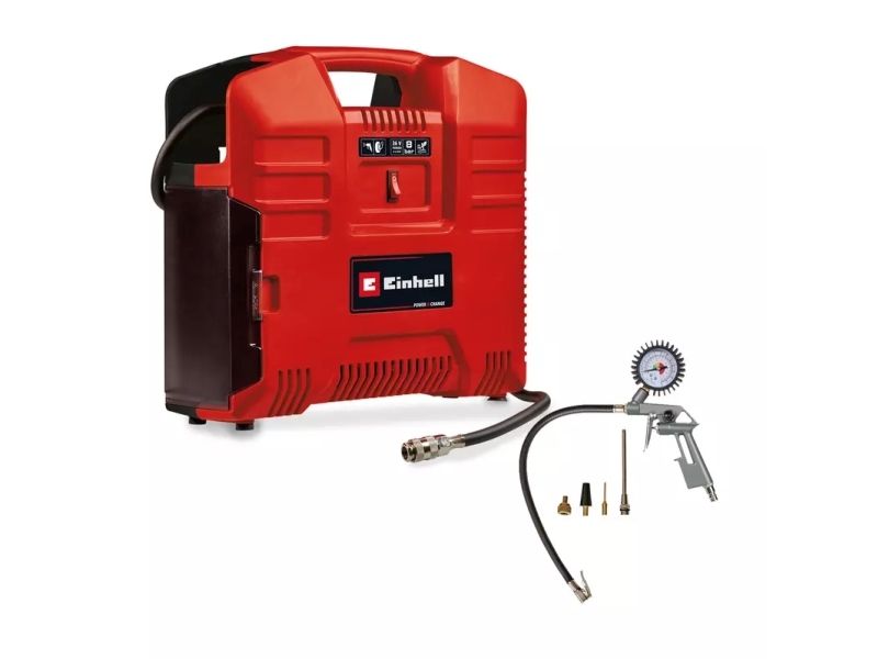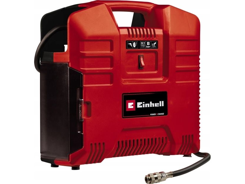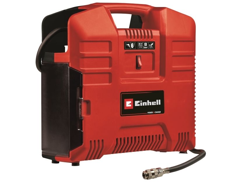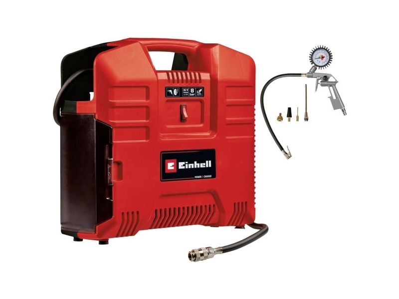 Einhell Power X-Change batteri-kuffert-kompressor Te-AC 36/8 Li OF Set-Solo Talrige anvendelser op til 8 bar Opbevaringsrum til trykluftslange integreret i huset Ekstra opbevaringsboks til adapter integreret i kabinettet Dækpåfyldningsmåleren kan nemt opbevares på kabinettet Einhell batteri-kuffert-kompressor Te-AC 36/8 Li OF Set-Solo hører til den højtydende Power X-Change familie. De genopladelige batterier med de eksklusive litium-ion-battericeller kan kombineres med alle medlemmer af Power-X-Change-familien. Batteri-kuffert-kompressoren er en lille, men kraftig hjælper til anvendelser op til maksimalt 8 bar. Dermed egner den sig for eksempel til hurtig oppumpning af cykel-, bil- og motorcykeldæk. Også krævende racerdæk stiller takket være den kraftfulde pumpe batteri-kuffert-kompressoren ikke noget problem. Den ergonomiske konstruktion og et praktisk håndtag sørger for mobilitet og en nem transport. Den oliefri, servicefri pumpe kræver kun en lav vedligeholdelse. Der er integreret en opbevaringsrum til trykluftslangen. En ekstra opbevaringsboks er beregnet til adapteren. Dækpåfyldningsmåleren kan nemt opbevares på kabinettet. Der medfølger en 2,50 meter trykluftslange med lynkobling, en adapter til anvendelse som udblæsepistol samt en dæktrykmåler og et tredelt strømforsyningssæt. Leveres uden batteri og oplader, disse fås separat. Til drift af kuffert-kompressoren skal der bruges 2 x 18 volt Power X-Change-batterier.