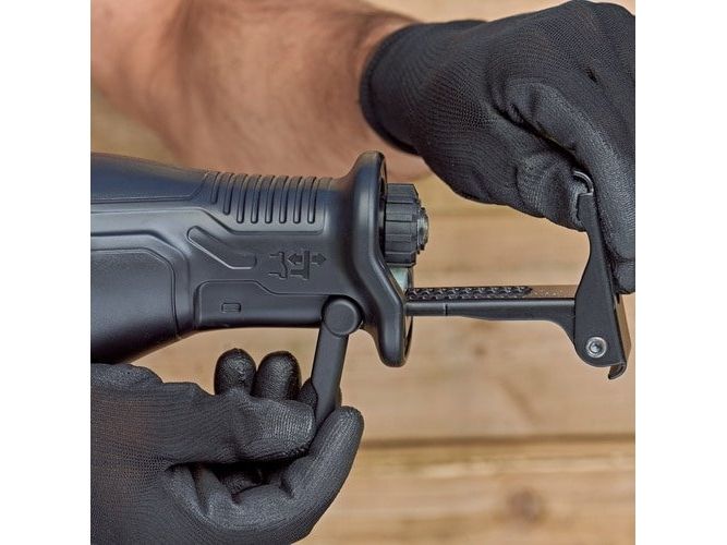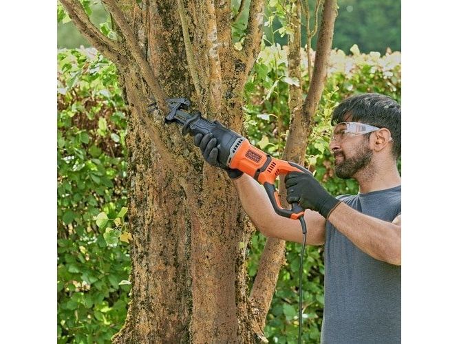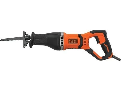 The BLACK+DECKER 750W corded reciprocating saw has the power and versatility to suit any task. The Removable Branch Holder allows for efficient and steady cutting of multiple sized branches and the Adjustable Shoe enables the shoe to be moved in or out to suit the task at hand.Tool-Free Blade Change allows for a quick and hassle-free blade swaps between applications. This saw comes with 2 blades and branch holder.Black & Decker BES301. Product colour: Black, Orange. Idle stroke rate (max): 2800 spm, Stroke length: 2 cm. Power source: Battery, Input power: 750 W