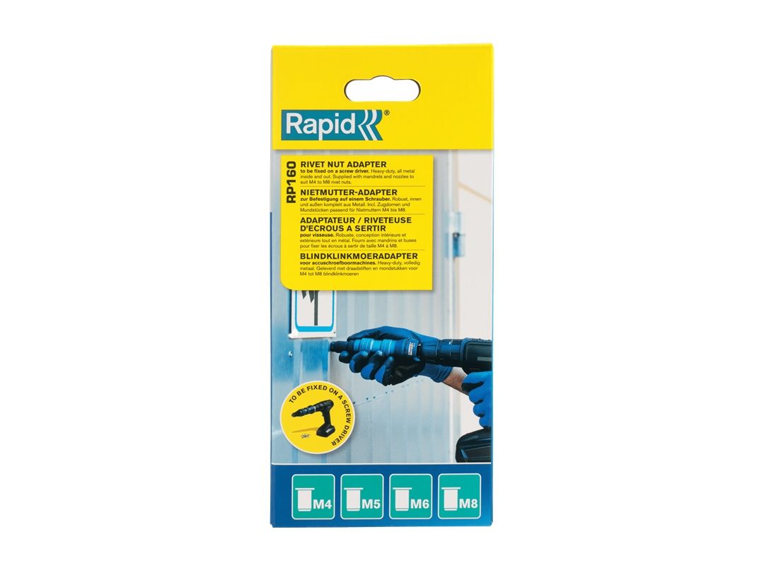 Rivet Nut AdapterRapid RP160. Product colour: Black, Blue. Width: 60 mm, Depth: 110 mm, Height: 245 mm. Package type: Box