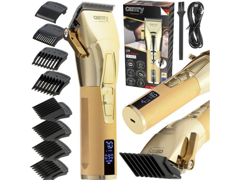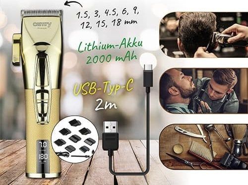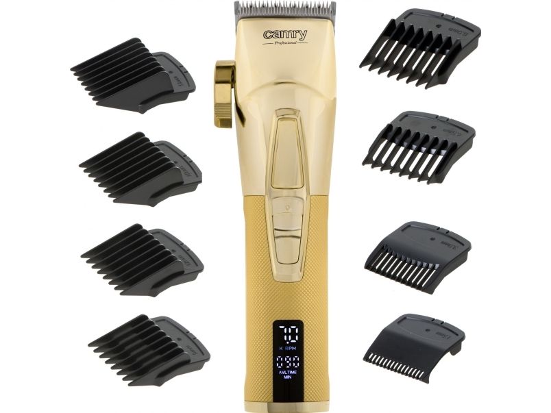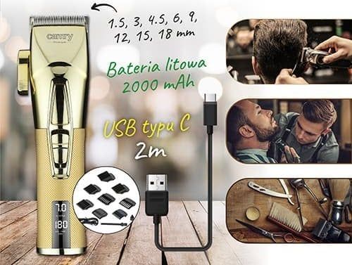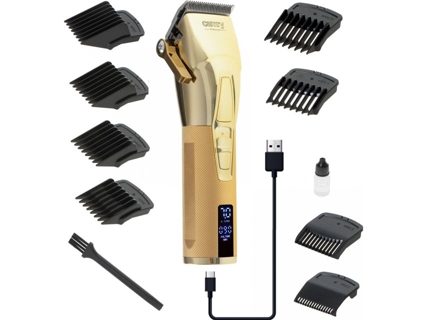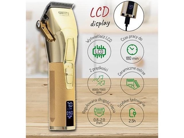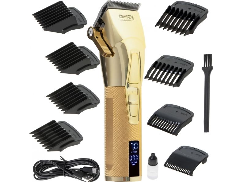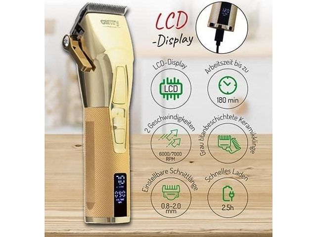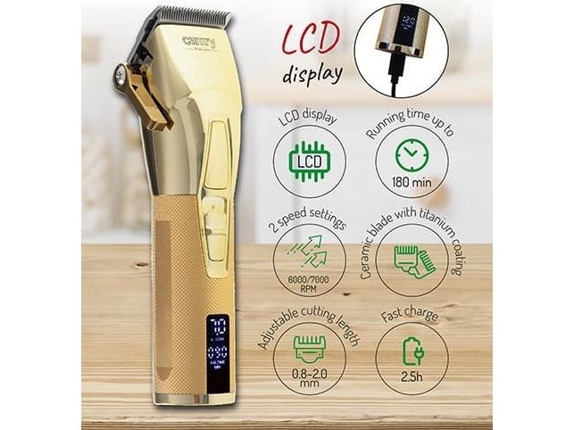 Max Power: 100W, Titanium/ceramic blade. LCD display, 2 speed 6000rpm & 7000rpm 2,5 hours fast charge, Running time up to 3h, High-capacity battery 2000MAh, 8 lenght: 1.5, 3, 4.5, 6, 9, 12, 15, 18 mm, 2m USB type-C wire, Set includes: brush, oil.