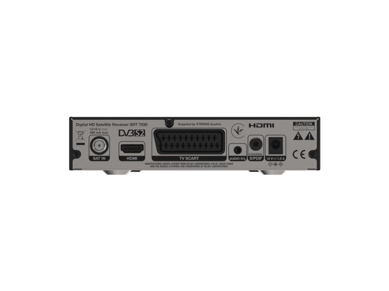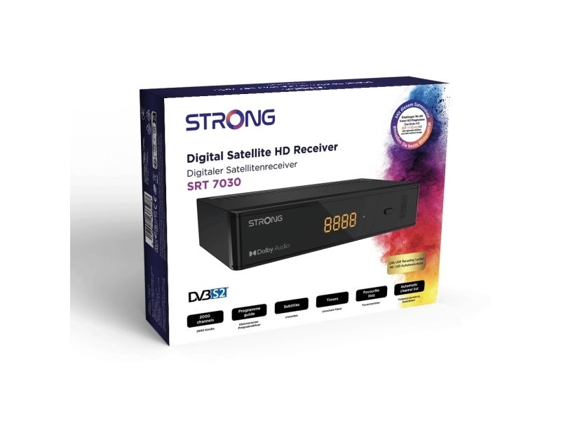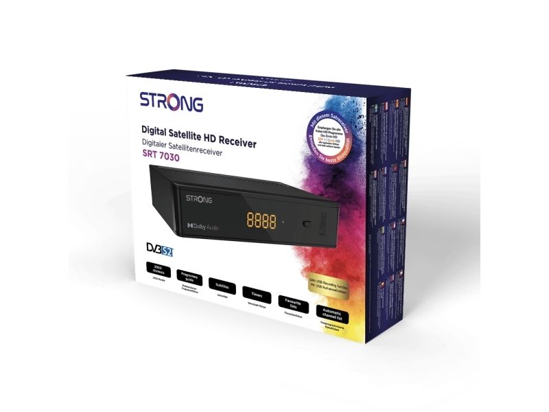 • Bemærk: Kun kvikguide medfølger - engelsk/tysk brugervejledning kan hentes på https://www.strong.tv/en/products/satellite-receivers/srt-7030/