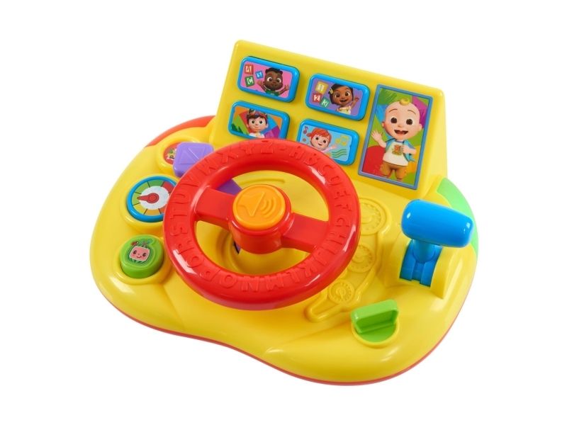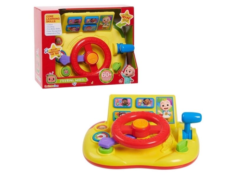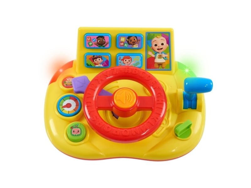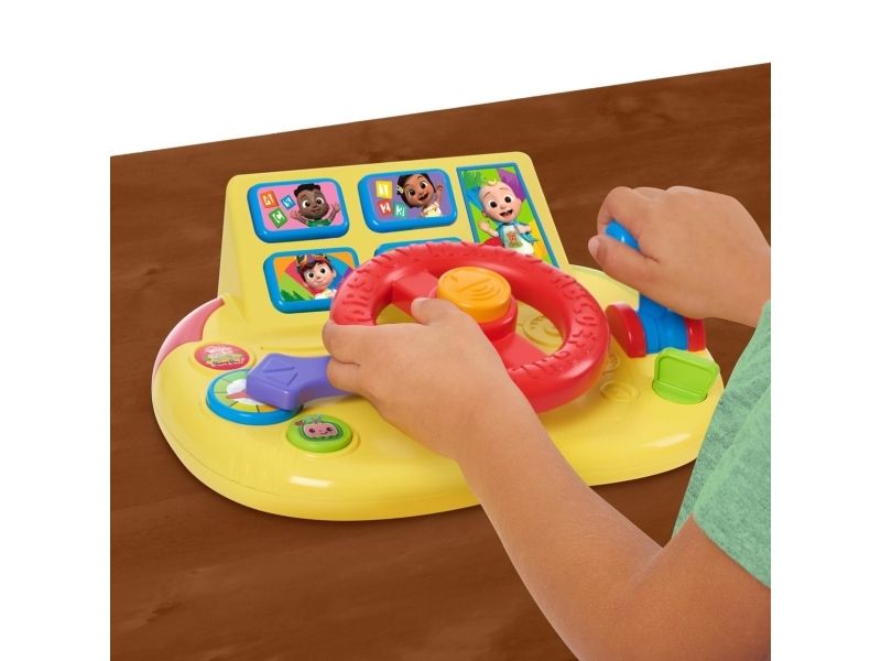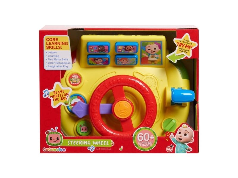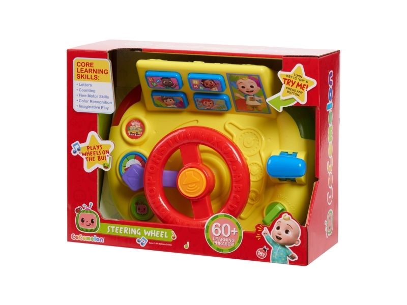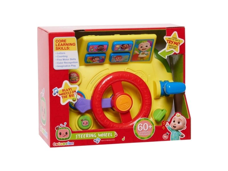 Lær og lek med JJ! Med CoComelon Learning Steering Wheel kan barna snu, skifte og vri seg til et morsomt læringseventyr med JJ og venner. Dette fargerike, interaktive leketøyet for småbarn er inspirert av "Wheels on the Bus"-episoden av CoComelon-animasjonsserien. Den inneholder over 60 fraser som vil hjelpe førskolebarn med å lære bokstaver, tall, finmotorikk, fargegjenkjenning og fantasifull lek. Trykk på en knapp for å velge mellom 4 læringsmoduser: ABC, 1-2-3, Musikk og Øye. Ved å late som de kjører, vil barna aktivere morsomme lyder og lære fraser. Barn kan vri nøkkelen, skifte gir, vri på rattet, signalisere en sving, tute på hornet og mer. Ta med deg CoComelon Learning Steering Wheel, så vel som resten av CoComelon lærings- og utdanningsleker, for å gjøre nysgjerrige småbarn glade og smarte! Krever 2 x AA-batterier (inkludert). For barn fra 18 måneder og oppover.