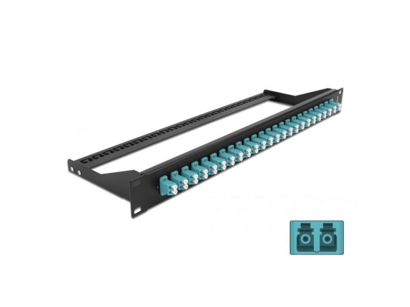 This patch panel by Delock can be mounted in a 19? rack. The jacks on the front and rear of the panel provide convenient connections for fiber patch cable.