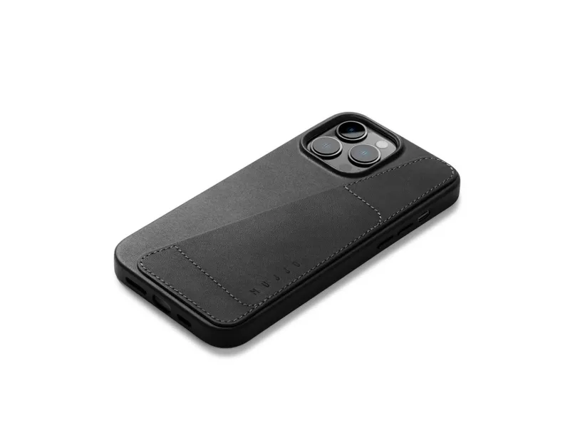 Crafted with precision and sophistication the Mujjo Full Leather Wallet Case for iPhone 14 Pro Max is an elegant yet practical solution for protecting your device. Combining high-quality materials refined craftsmanship and thoughtful design this case offers timeless durability while serving as a sleek wallet alternative to store your essentials.Luxurious vegetable-tanned leather finishIntegrated card pocket with sleek storage capacityPrecision-machined metal buttons for optimal responsivenessProtection-focused design with raised bezels for screen and camera safetyJapanese microfiber interior for extra protection and comfortLuxurious vegetable-tanned leather finish The Full Leather Wallet Case is crafted from vegetable-tanned leather sourced from the Netherlands renowned for its rich texture and environmental sustainability. Over time the leather develops a unique patina making your case genuinely personal. The black shade exudes sophistication and timeless style while the minimalistic design beautifully complements the contours of your iPhone 14 Pro Max. Integrated card pocket with sleek storage capacity This case doubles as a wallet featuring a neatly designed leather card pocket that comfortably holds two to three bank ID or travel cards. Say goodbye to bulky pockets and experience stylish convenience for your everyday essentials. Precision-machined metal buttons for optimal responsiveness The side buttons of this case are crafted from precision-machined metal to ensure tactile responsiveness and durability. The buttons are meticulously dyed to match the leather blending seamlessly into the overall aesthetic of the case and ensuring functionality meets style. Protection-focused design with raised bezels for screen and camera safety Designed to guard against everyday wear and tear the case includes a 1mm raised bezel to keep abrasive surfaces away from your iPhone's screen. Additionally the raised bump around the rear camera protects the lenses from damage ensuring uncompromised safety without sacrificing style. Japanese microfiber interior for extra protection and comfort The case?s interior is lined with luxurious Japanese microfiber offering a satin-like finish that cradles your iPhone with care. This soft yet durable fabric adds an extra layer of protection while maintaining a lightweight and slim profile. Package includesMujjo Full Leather Wallet Case for iPhone 14 Pro Max ? BlackProduct specificationsColour: BlackCompatible with iPhone 14 Pro MaxVegetable-tanned leather exteriorHolds up to 3 cards1mm raised bezel for screen protectionRaised camera lens bump for added safetyPremium Japanese microfiber liningDesigned for an ultra-slim profile