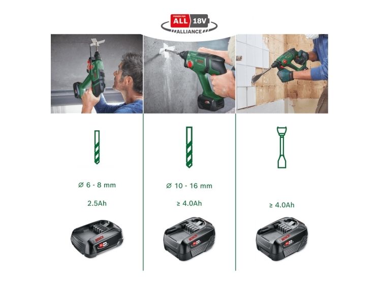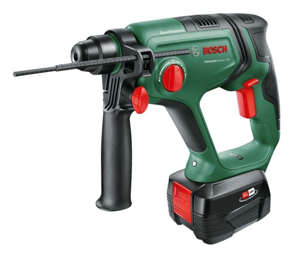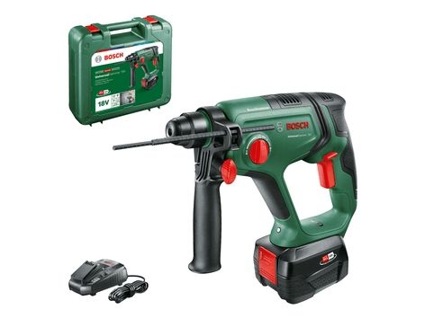 This cordless powerhouse puts the pleasure back into drilling thanks to its combination of high-impact force, light handling, and flexibility. It propels a 2.0 J pneumatic Bosch hammer mechanism that is ideal for drilling holes up to 16 mm diameter into concrete, with an SDS plus drill bit. This impressive force also knocks down wall tiles and chisels cable ducts. For less fatigue on long jobs, DIY enthusiasts will appreciate the lightweight, compact hammer size. And with the vibration and rotation control, the tool shakes less and is more stable.