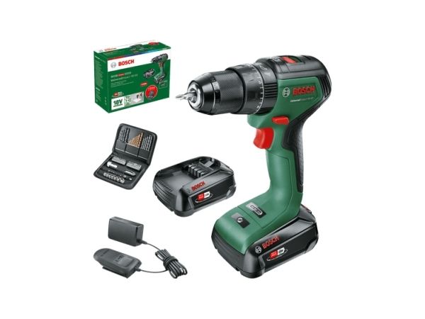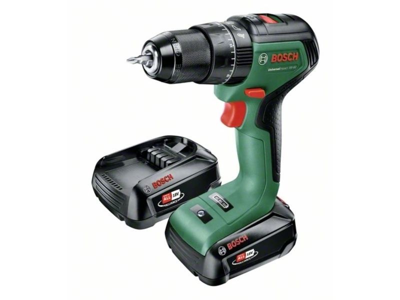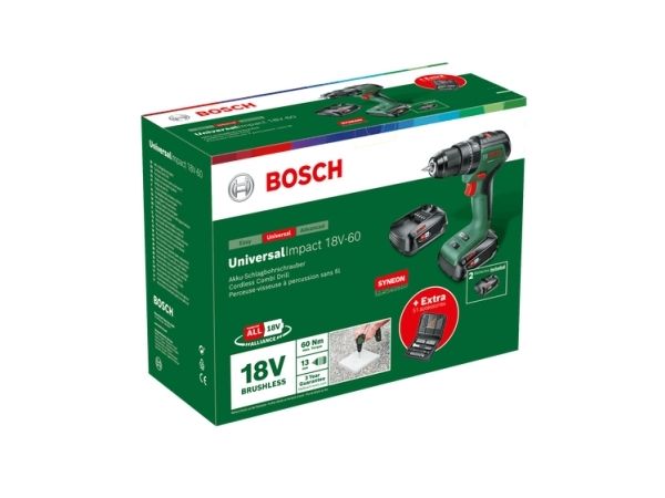 Batteridrevet bore- /skruemaskine UniversalImpact 18V-60, kraftfuld skrue og slagboring med maksimal udholdenhed og optimal komfort, børsteløs motor sørger for fremragende boreeffekt og længere driftstid, robust 13-mm-metalfor sikker borfastgørelse og nemt skift af tilbehør, optimal kontrol med 20 momentindstillinger og et maksimalt hårdt drejemoment på 60 Nm, 2-trins gear, bore- og slagboremaskine, ubesværet skruer og slagboring i murværk, træ, metal og plast, Syneon Technology for optimal kraft og udholdenhed efter behov, 18V Power Power FOR ALL - batteriet til alle Bosch Bosch 18V Home & Garden-haveredskaber, 2 x batteri PBA 18V 2,0 Ah, oplader al 18V-20, 51-delt tilbehørssæt (1 619 GX1 400), bæretaske