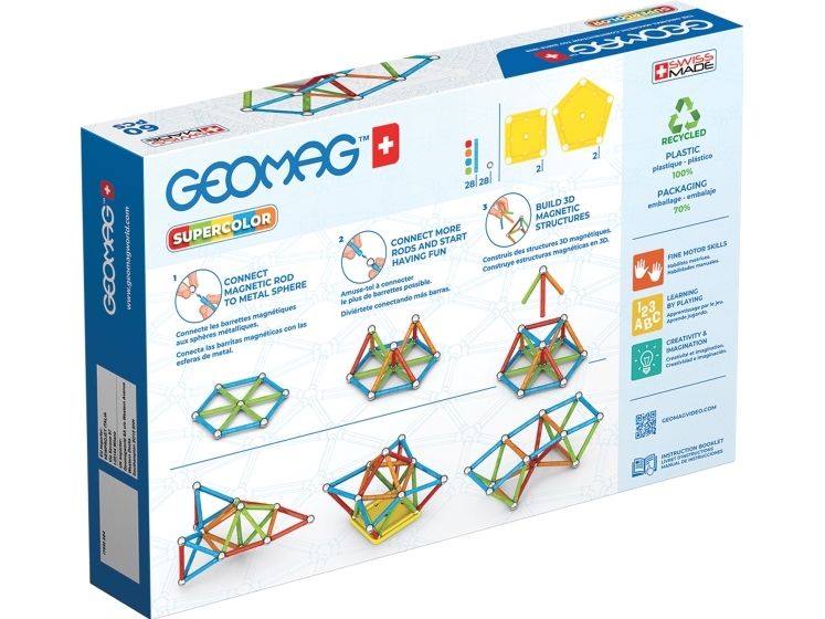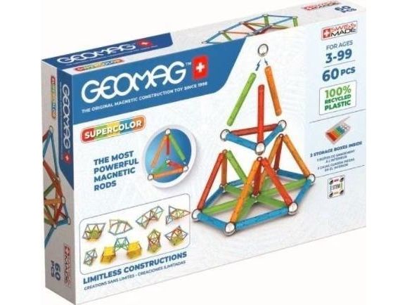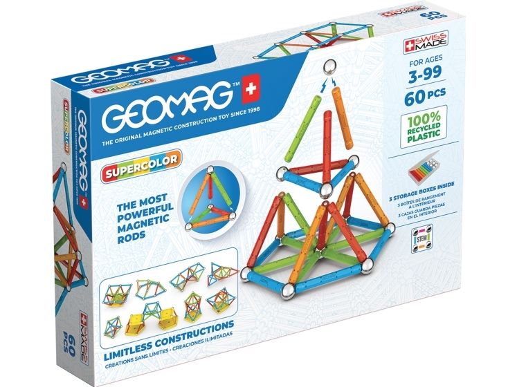 Takket være de enkle Geomag elementene og magnetismens magi kan du bygge uendelige 3D-konstruksjoner ved å bruke kreativiteten og fantasien din. Det er de avlange magnetstengene, stålkulene og de forskjellige panelformene som utgjør byggesystemet, som stimulerer til lek og læring uansett alder. Alt plast er 100% resirkulerbart. Denne pakken inneholder 60 byggeelementer. Fra 5–99 år.