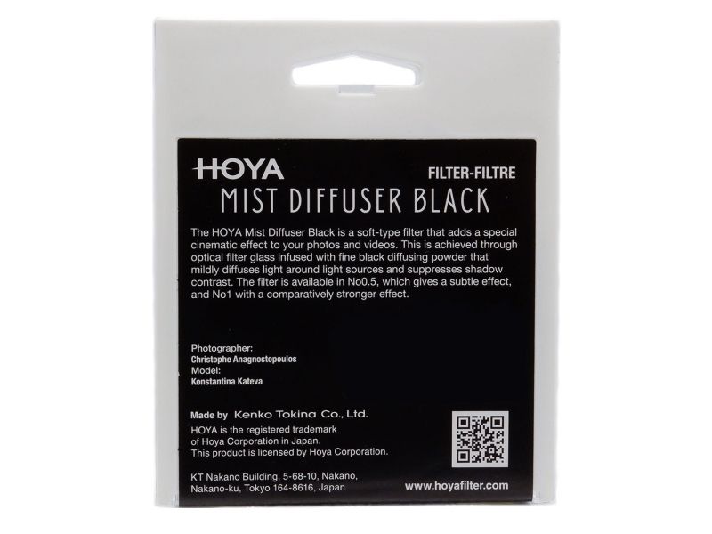 OVERVIEWThe HOYA MIST DIFFUSER BLACK series is an effect filter that creates a black mist effect through diffusing objects in an image, giving it a stylish cinematic look. This special kind of mist effect is achieved by equally distributing a fine black nano powder between two layers of optical glass. Built with a non-coated glass surface for a better-looking effect and enhanced flares. With two versions available, MIST DIFFUSER BLACK No0.5 and No1, it is possible to select the desired intensity for your photo.LIKE A SCENE FROM A MOVIEThe HOYA MIST DIFFUSER BLACK is a soft type filter that adds a special cinematic effect to your photos and videos through diffusing light around light sources and slightly suppressing shadow contrasts, creating exquisite nuances reminiscent of a scene in a movie. The appeal of the MIST DIFFUSER BLACK is that it allows you to obtain a cinematic quality on the spot, without retouching.Thanks to its soft effect, the HOYA MIST DIFFUSER BLACK is also great for portrait shots. It smoothens skin texture and reduces overall contrast, giving models a stylish look. Compared to other soft filters, the MIST DIFFUSER BLACK does not whiten the image.The MIST DIFFUSER BLACK can also create a special atmosphere in landscape photography. For example, it makes for a fantastic atmosphere by blurring the light through the trees. If the exposure compensation is set to a brighter setting, the blurring of light becomes even stronger.MIST DIFFUSER BLACK IN VIDEOGRAPHYThe HOYA MIST DIFFUSER BLACK gives videos a classic vintage look that is reliably repeatable across various cameras and lenses. It takes away the time-consuming work to add a diffusion effect in post-production and gives camera operators and directors instant feedback on the set.CHOOSE BETWEEN NO0.5 AND NO1 FOR YOUR PREFERRED STRENGTHThe HOYA MIST DIFFUSER BLACK series is available as No0.5, for a rather mild softening effect, and No1 with a comparatively stronger effect. Compared to the No0.5, the MIST DIFFUSER BLACK No1 has a greater light diffusing effect especially in strong backlit or night scenes. The No0.5 keeps a more subtle effect, making the filter perfect in any situation, even with strong backlighting.TIPS FOR SHOOTING- MIST DIFFUSER BLACK No0.5 and No1 are recommended for different scenes. No0.5 is suitable for night scenes and backlit scenes when the sun starts to set, while No1 is more suitable for forward lit or low light situations.- The soft effect is stronger when the focal length of the lens is on the telephoto side and weaker at the wide-angle side.- The effect may vary depending on the type of light source and other shooting conditions like for example shutter speed.- The effect seen in the viewfinder and the result of shooting (depending on print, monitor size, etc.) may differ.- The final result will also change depending on the exposure compensation, so it is recommended to use exposure compensation if necessary.- FEATURES- Aluminum frame for best durability while being lightweight.- Low profile frame to minimize risk of vignetting.