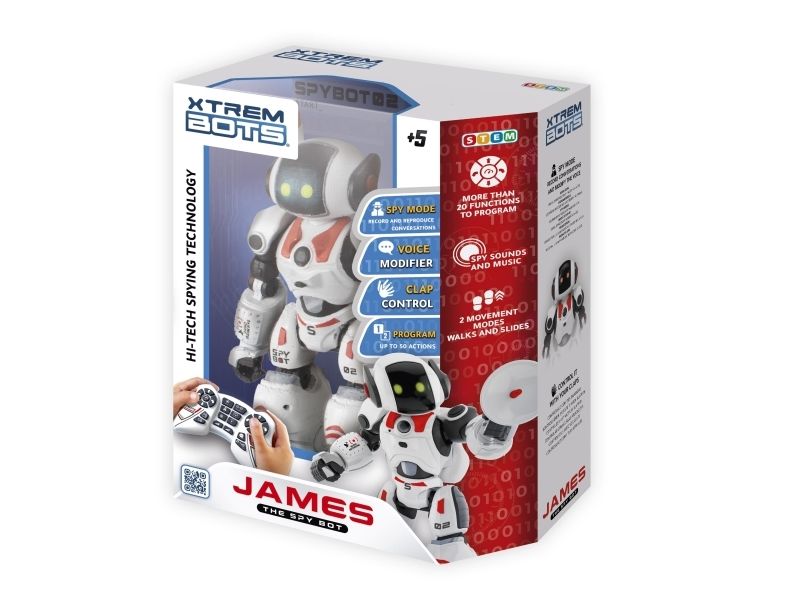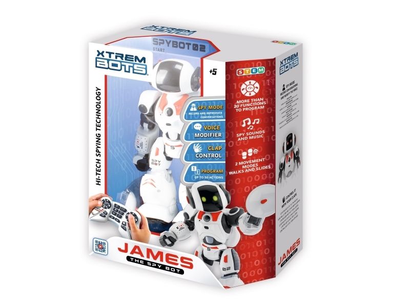 Sammen med James-The Spy Bot kommer du inn i en verden av robotteknologi og programmering den morsomme måten. Han har over 50 programmerbare handlinger og mer enn 20 funksjoner å tilby. Han kan snike seg frem i en gående eller glidende bevegelse. Hans forskjellige lyder og lys vil gjøre ham ustoppelig.