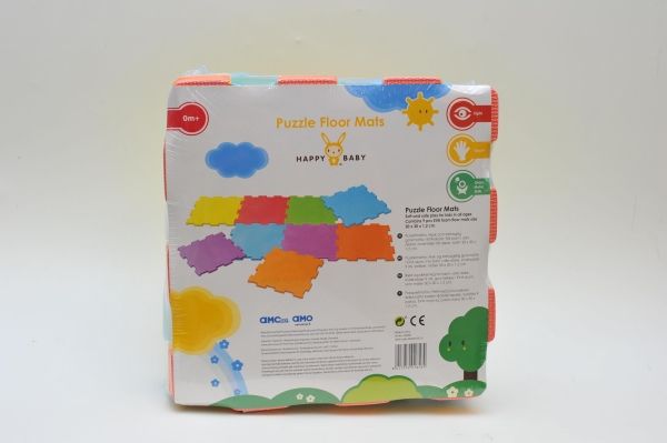 Gulvspill i myk EVA skum. Perfekt til å leke eller krabbe på. 9 fargestrålende puslespillbrikker, hvor hver er 30x30 cm. Sett de sammen i en firkant, på rekke eller sammen med en ekstra pakke til et enda større teppe. Fra nyfødt.