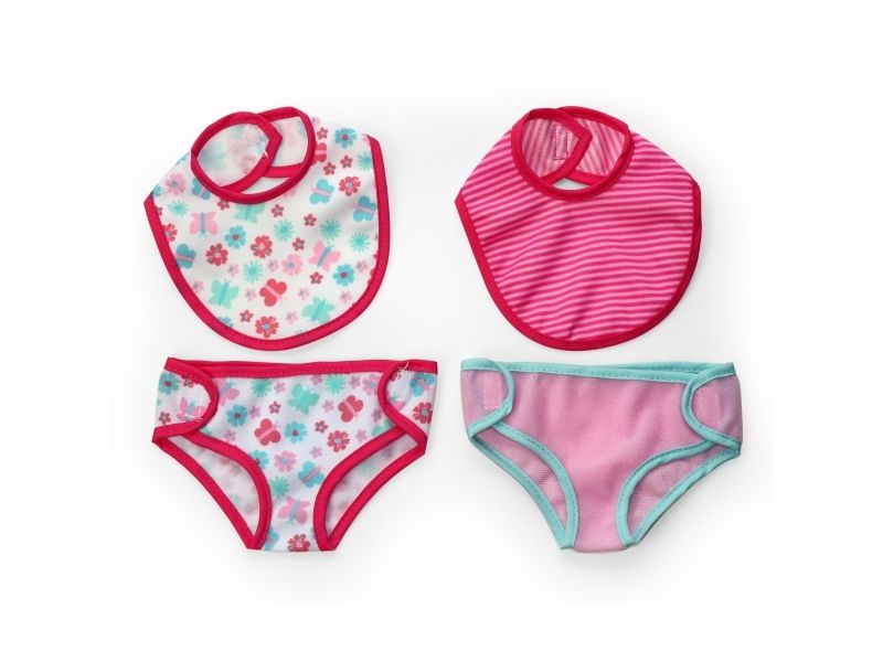 Tid for å pleie til baby dukken din og skifte på henne, slik at hun får en ren og tørr truse. Akkurat slik som en ekte mor og far hadde gjort! 2 Happy Friend sett med smekker og matchende truser med velcro. Passer til dukker i størrelse 33-43 cm. Fra 24 måneder.