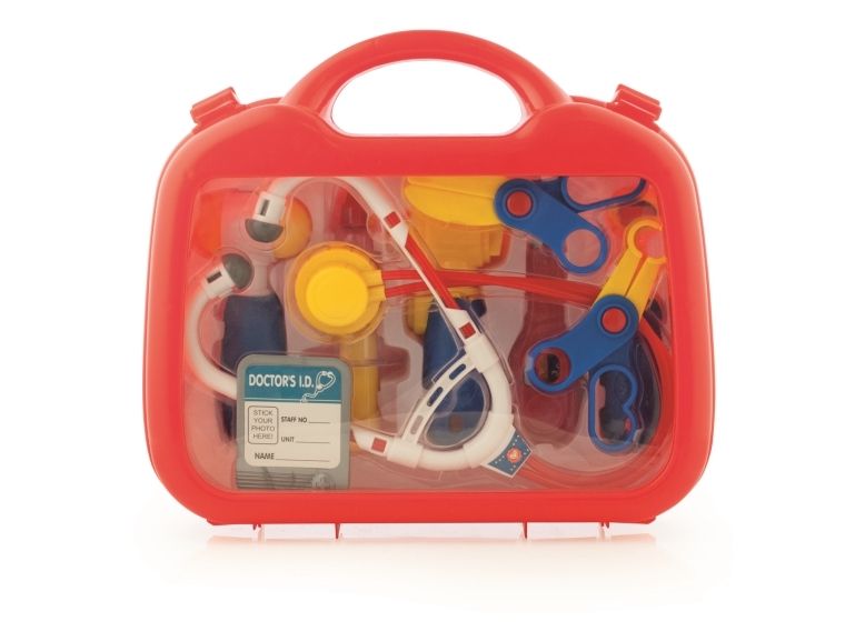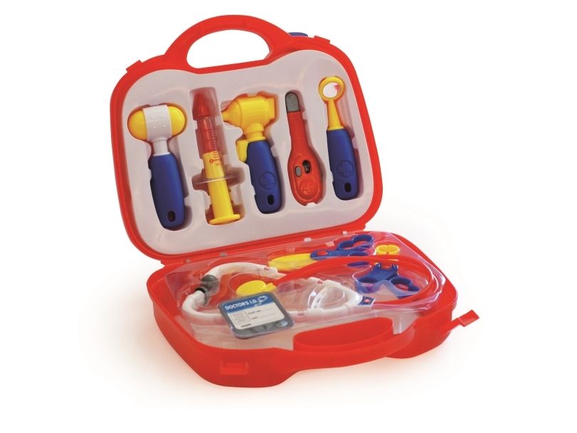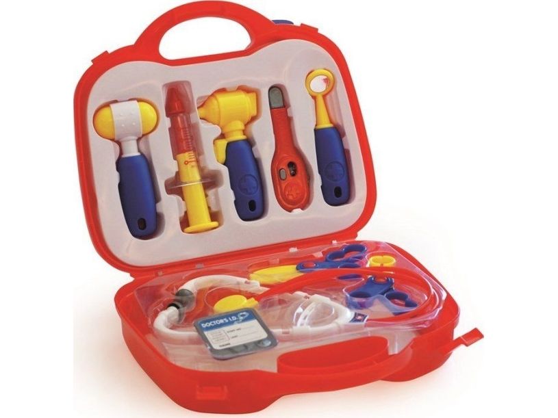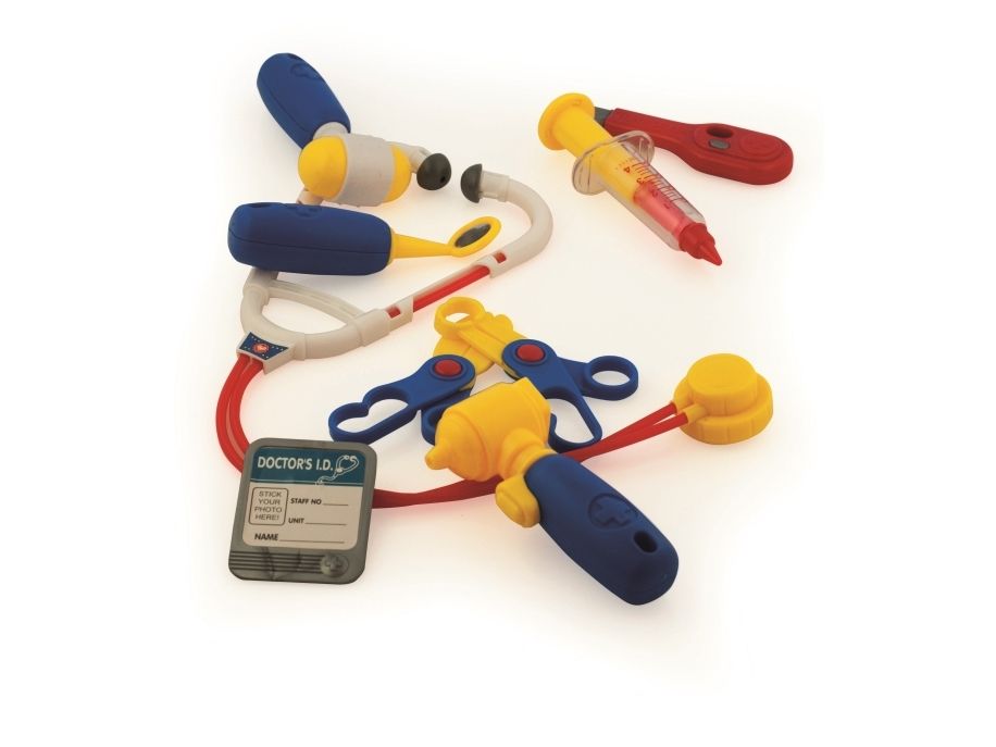 Hjelp barna å bli kjent med legens instrumenter. Denne medisinske kofferten inneholder: ID-kort for lege, stetoskop, otoskop, tannspeil, sprøyte, termometer, saks, reflekshammer og tang. Fra 3 år.