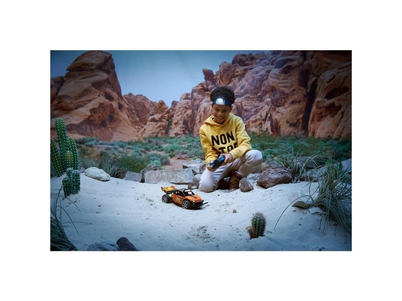 Spektakulær fjernstyret buggy , som klarer ethvert terræn og har fungerende sporlys, som gør, at du kan fortsætte ræset også efter, at solen er gået ned. Den hurtige racer kan nå en tophastighed på 7,5 km i timen og er til både inden- og udendørs kørsel. Har fuldfunktions fjernbetjening med mange retninger. 2,4GHz sender giver masser af sjov uden forstyrrelser for op til 10 kørere ad gangen. Fra 6 år.