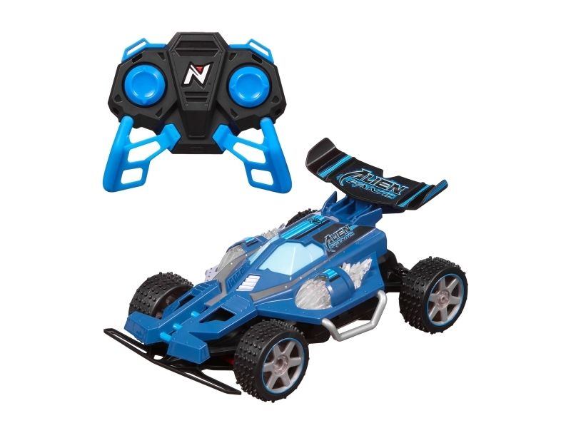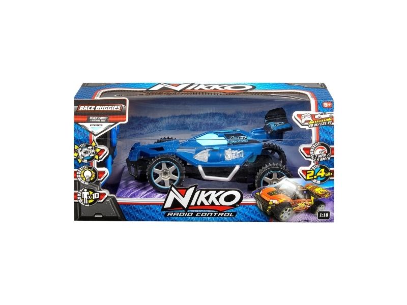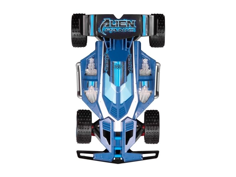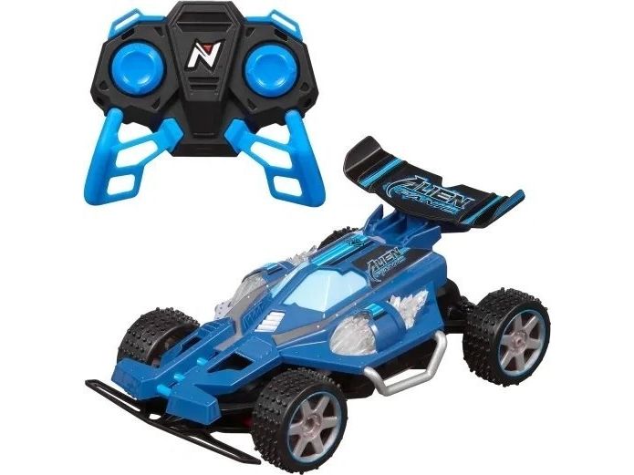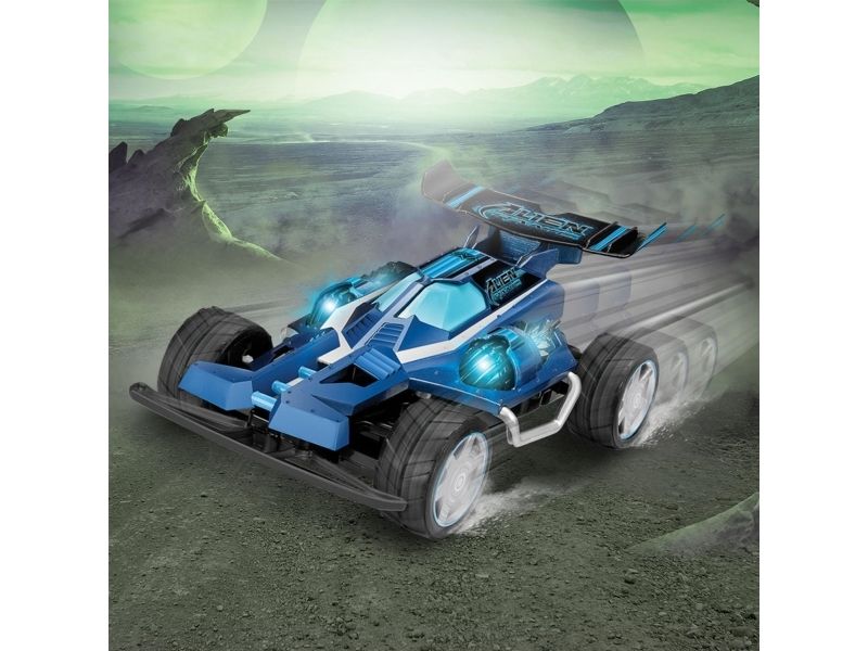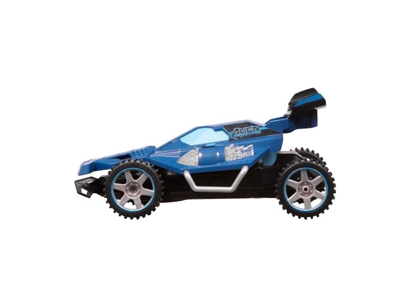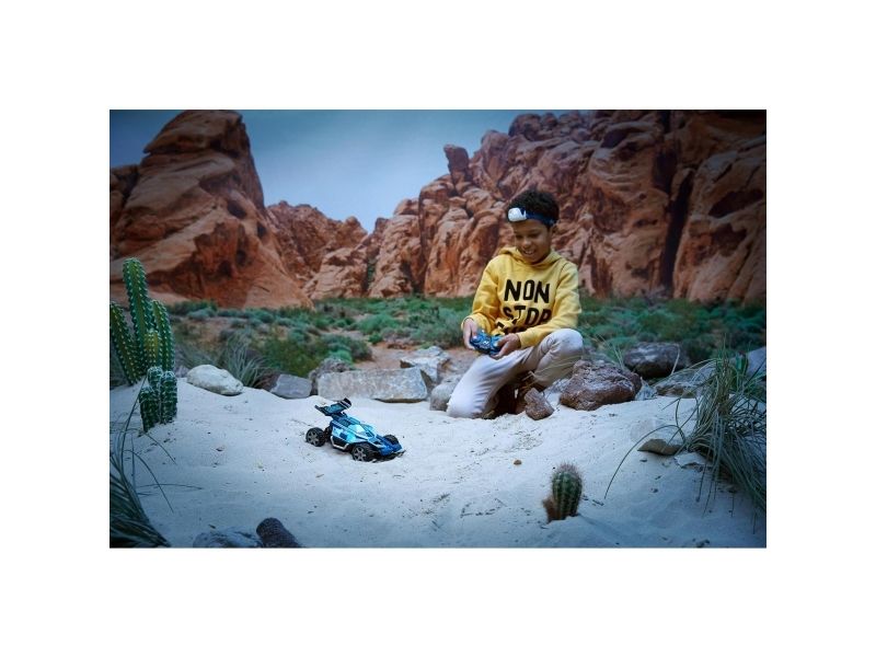 Terrængående fjernstyret buggy med sporlys. Tophastighed 7.5 km/t. Spektakulær fjernstyret buggy, som klarer ethvert terræn og har fungerende sporlys, som gør, at du kan fortsætte ræset også efter, at solen er gået ned. Den hurtige racer kan nå en tophastighed på 7,5 km i timen og er til både inden- og udendørs kørsel. Har fuldfunktions fjernbetjening med mange retninger. 2,4GHz sender giver masser af sjov uden forstyrrelser for op til 10 kørere ad gangen. Fra 6 år.