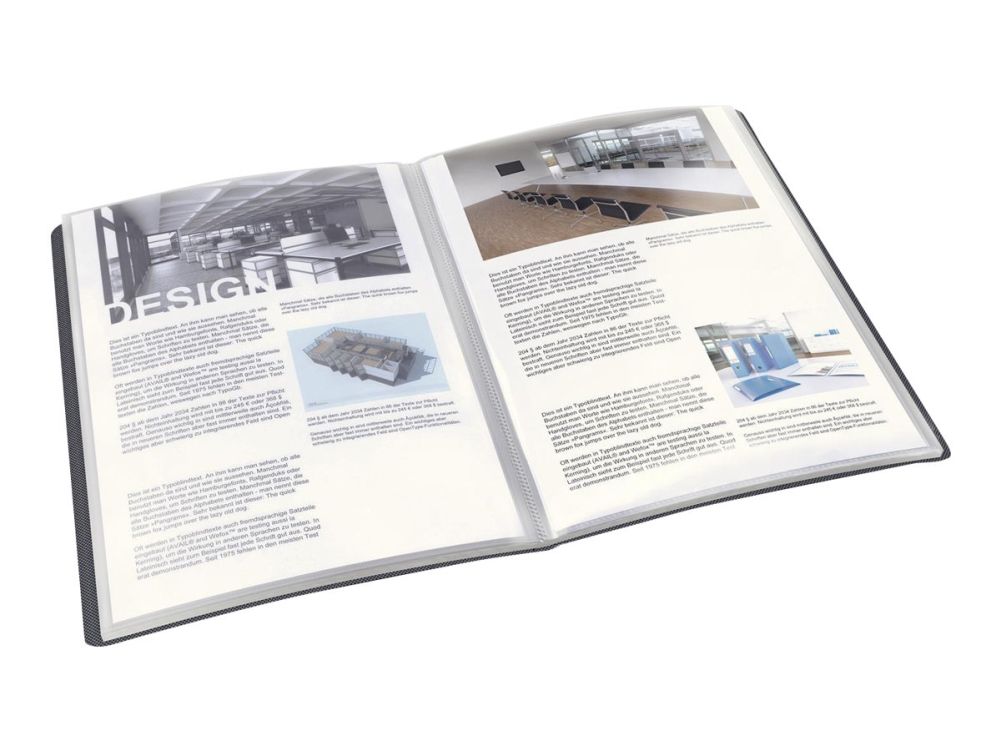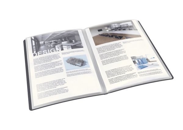 Presentasjonsmappe med innstikklomme på omslaget. Meget god PP i Vivida-design. 20 lommer. Transparent PP. Til oppbevaring og presentasjon.