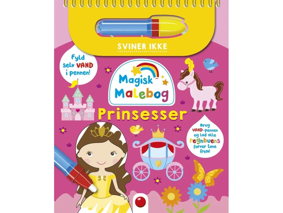 Magisk! Mal med vand! Fyld vand i pennen og farvelæg de 6 sider. Når motivet er tørt, er farven væk, så bogen kan bruges igen og igen!