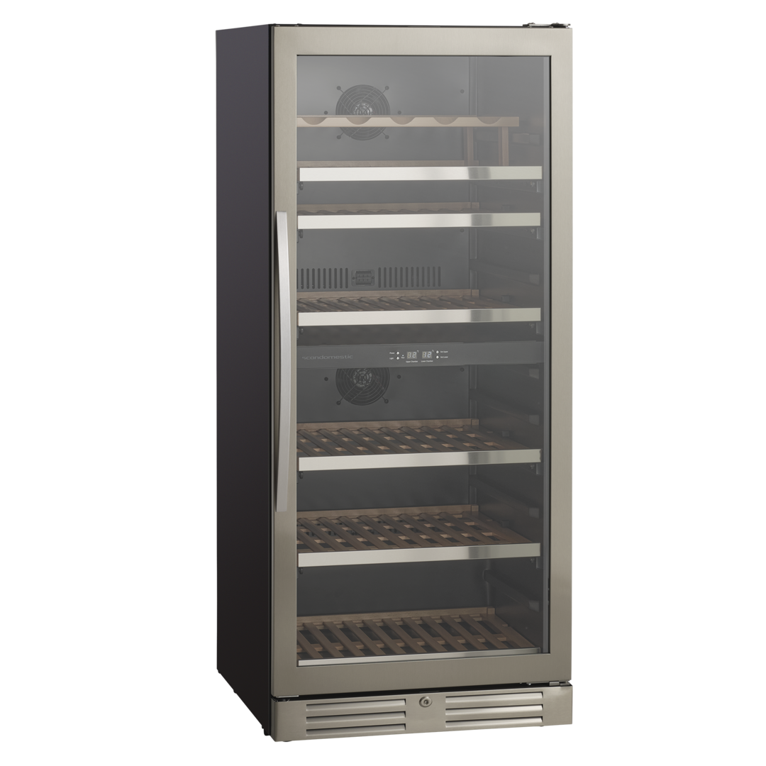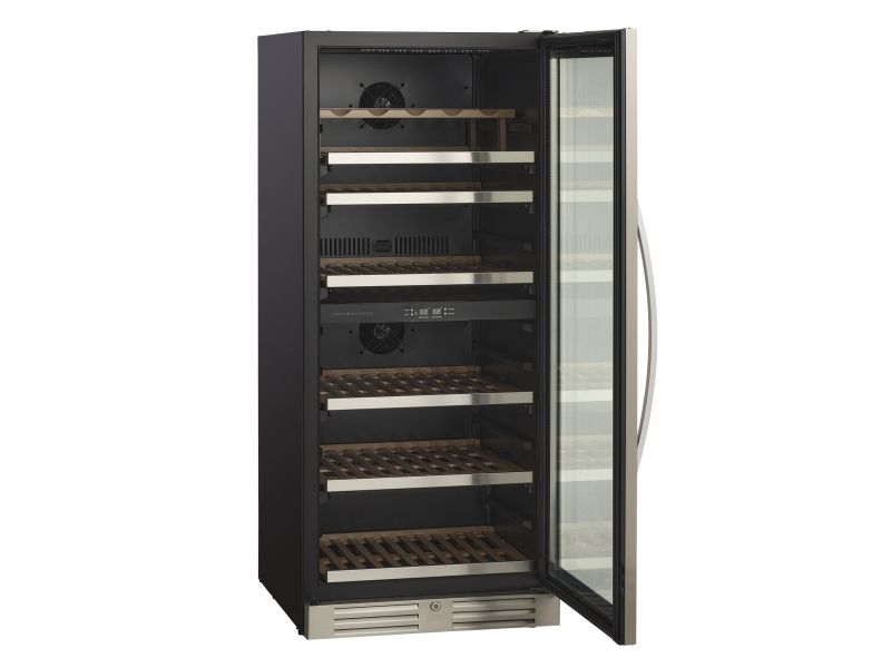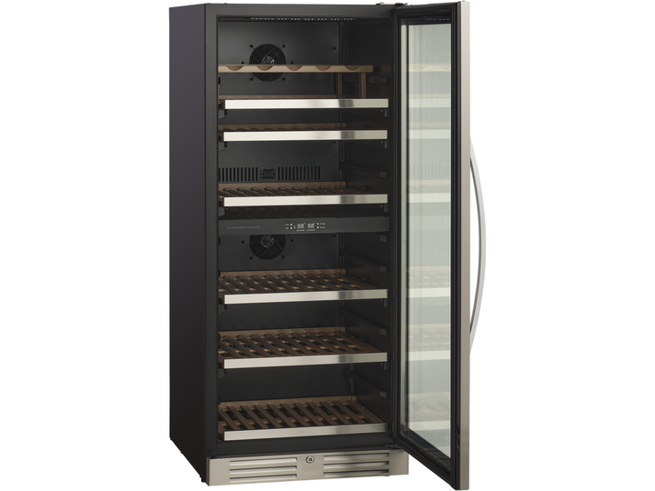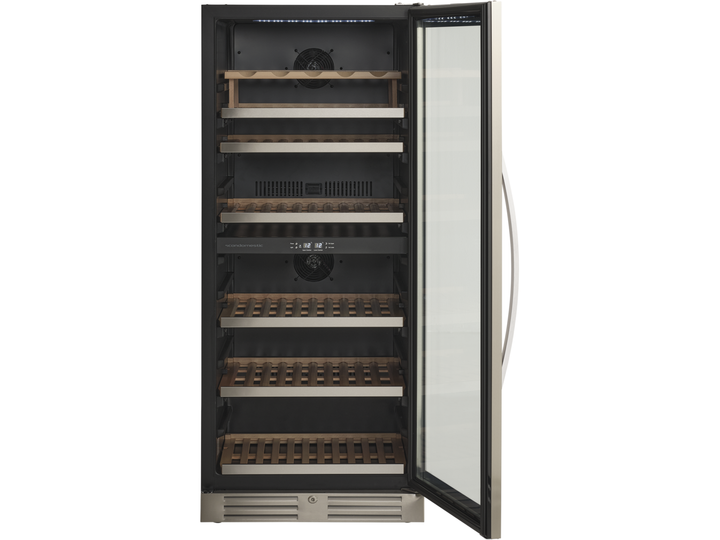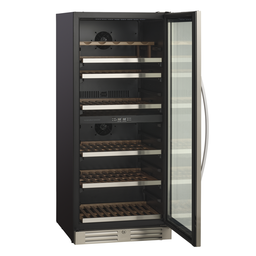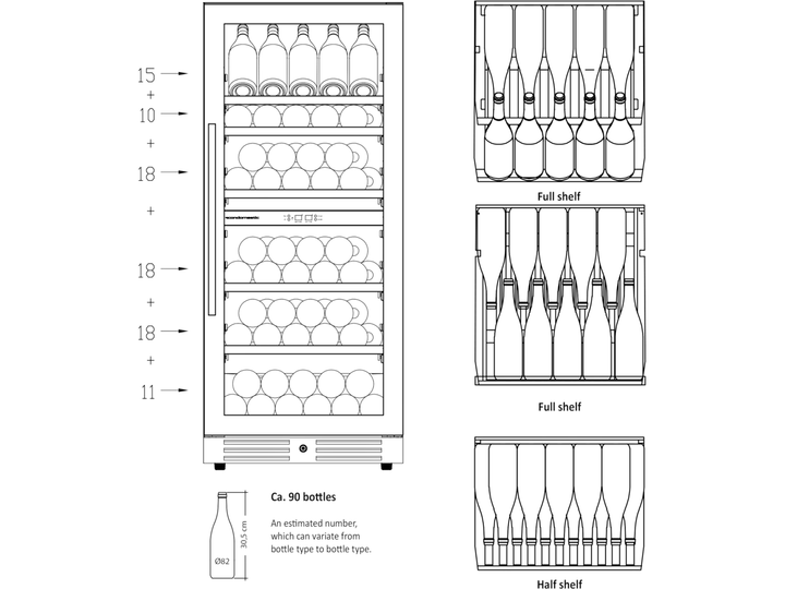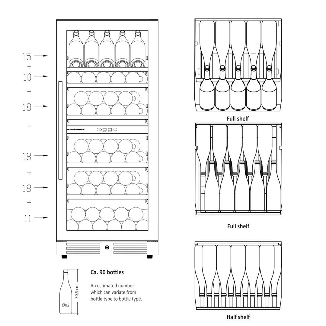 Den angivende flaskekapacitet er udregnet med en bordeauxflaske som standard og uden hylder i skabet. Dvs. at det faktiske antal af flasker som skabet kan indeholde, med hylder monteret, vil være mindre end den angivne mængde i produktets specifikationer.