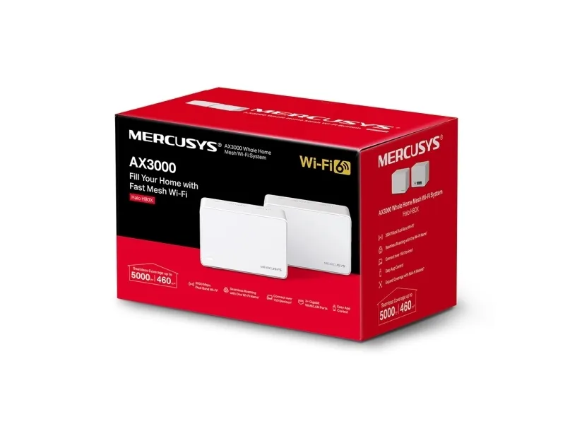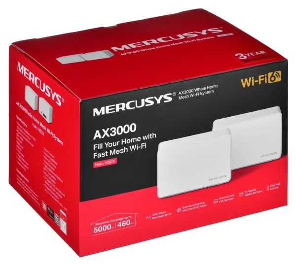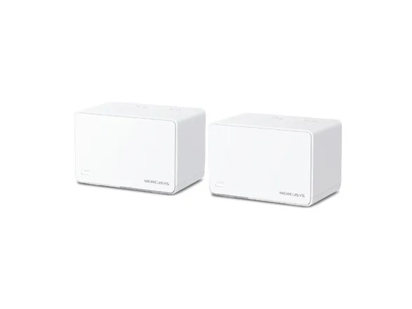 Easily Extend Your Coverage The Halo Whole Home WiFi kit includes multiple units to fit any house type. If that’s not enough, you can expand Mesh WiFi coverage anytime by simply adding more Halos.Mercusys AX3000 Whole Home Mesh WiFi 6 System. Product colour: White, Antenna type: Internal, Product type: Mesh system. Wi-Fi band: Dual-band (2.4 GHz / 5 GHz), Top Wi-Fi standard: Wi-Fi 6 (802.11ax), WLAN data transfer rate (max): 3000 Mbit/s. Firewall security: SPI Firewall. Width: 128 mm, Depth: 81 mm, Height: 83.7 mm. Number of products included: 2 pc(s), Number of units included: 2 pc(s)