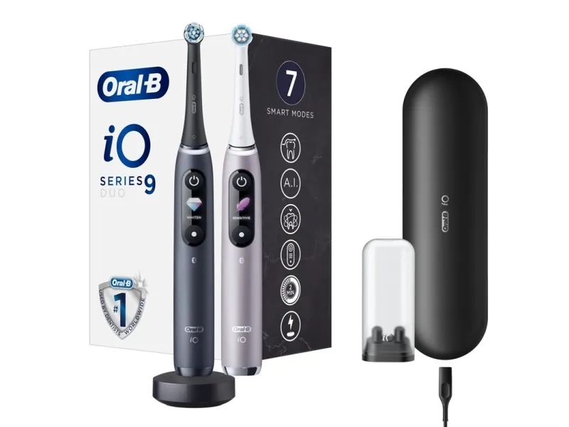 Brand- Oral-B. Model- iO Series 9 Duo Pack. Colour- Black, Pink. For- For adults. Power supply- Battery. Storage battery type- Li-ion. Charging time- 180 min. Number of operating modes- 7. Number of speeds- 2. Rotational-reverse movements per minute- 17400. Stand included- Yes. Water resistance- Yes. Timer- Yes. Contents- 2 x toothbrushes with tips, stand-charger, travel case, tip holder. Mandatory warranty- 24 mo. Additional information- Pressure sensor.