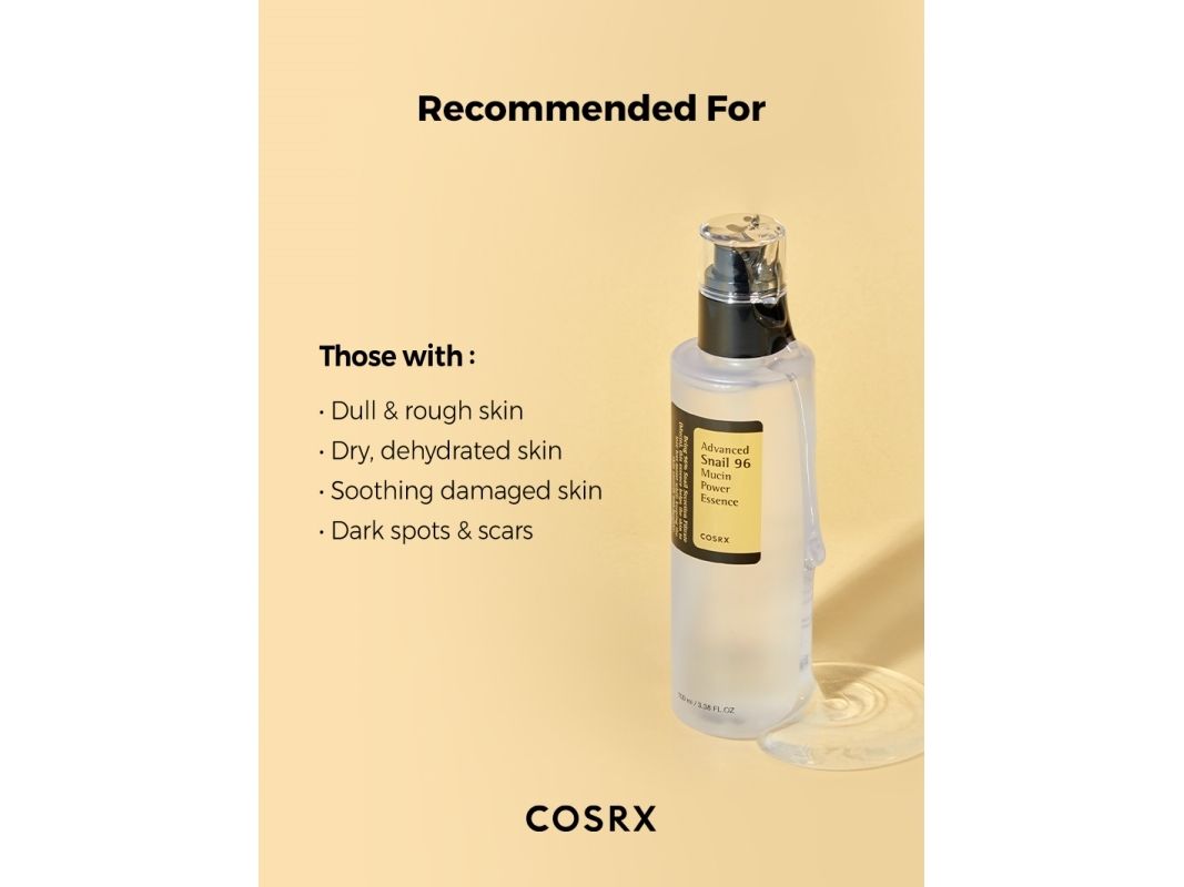 Advanced Snail 96 Mucin Power Essence har en minimal liste af ingredienser udover snegleslim, herunder beroligende allantoin og panthenol. Den behandler mange forskellige hudproblemer og kan anvendes af alle hudtyper.