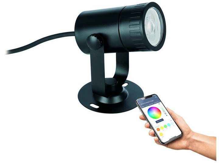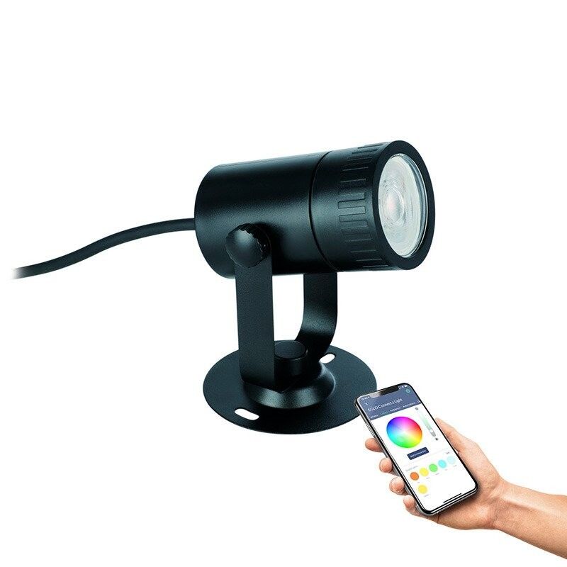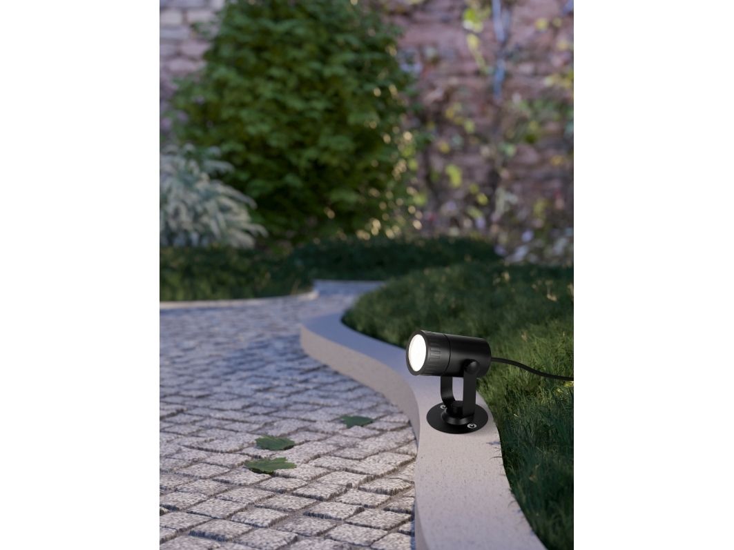 EGLO CONNECT-Z NEMA-Z udendørs spot i sort med spyd. Højde 11,5 cm, længde 12,5 cm, Spydlængde 16,5 cm, Spotdiameter: 9 cm. GU10, 4,9 watt, 345 lumen, 2700-6500 kelvin, RGB + Tunable white. Spottet kan dæmpes og styres med fjernbetjening (medfølger ikke), via AwoX Home Control app (gratis), eller ved stemmestyring. Zigbee er kompatibel med Amazon Alexa og Google Assistent. IP65. Dette produkt indeholder en lyskilde med energieffektivitetsklasse: G.