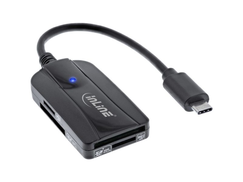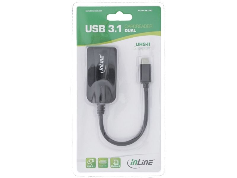 This card reader is the ideal companion for traveling, thanks to USB 3.0 it is super fast and very flexibleInLine Card reader USB 3.1 USB-C, for SD/SDHC/SDXC, microSD, UHS-II compatible. Compatible memory cards: HC MMC+, MMC, MMC+, MicroSD (TransFlash), MicroSDHC, MicroSDXC, SD, SDHC, SDXC, Product colour: Black, Data transfer rate: 5000 Mbit/s. Interface type: USB 3.2 Gen 1 (3.1 Gen 1) Type-C. Package type: Blister