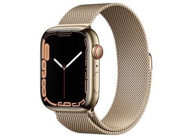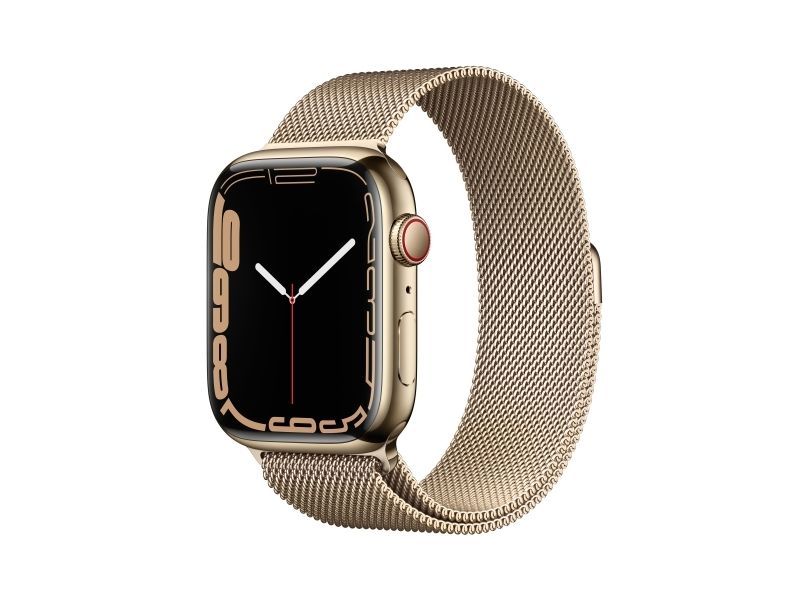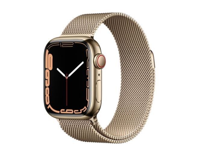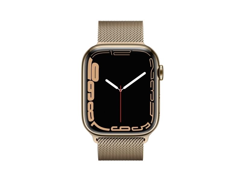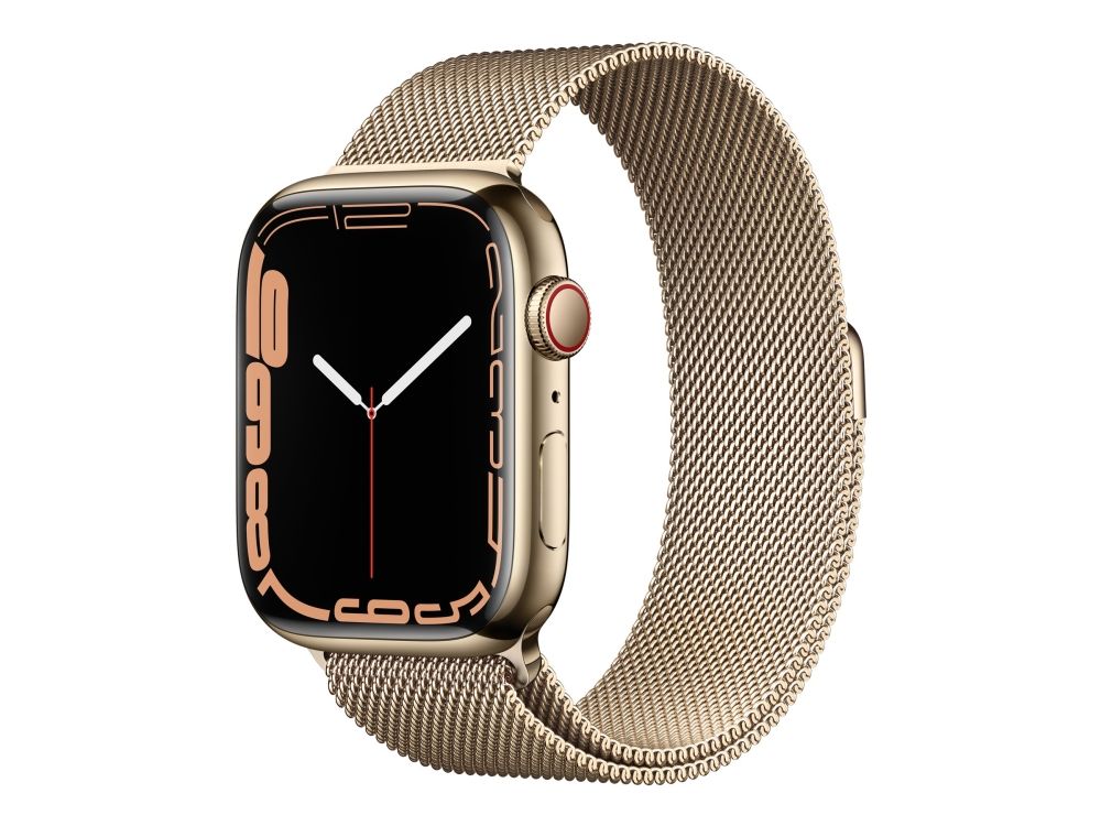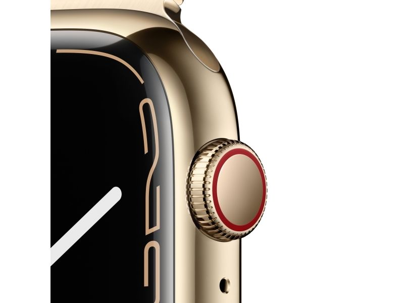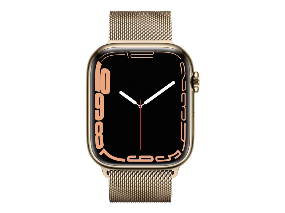 [OUTLET] - Apple Watch Series 7 (GPS + Cellular) - 45 mm - guld rustfrit stål - smart ur med milanesisk løkke - rustfrit stål - guld - håndledsstørrelse: 150-200 mm - 32 GB - Wi-Fi, Bluetooth - 4G - 51.5 g