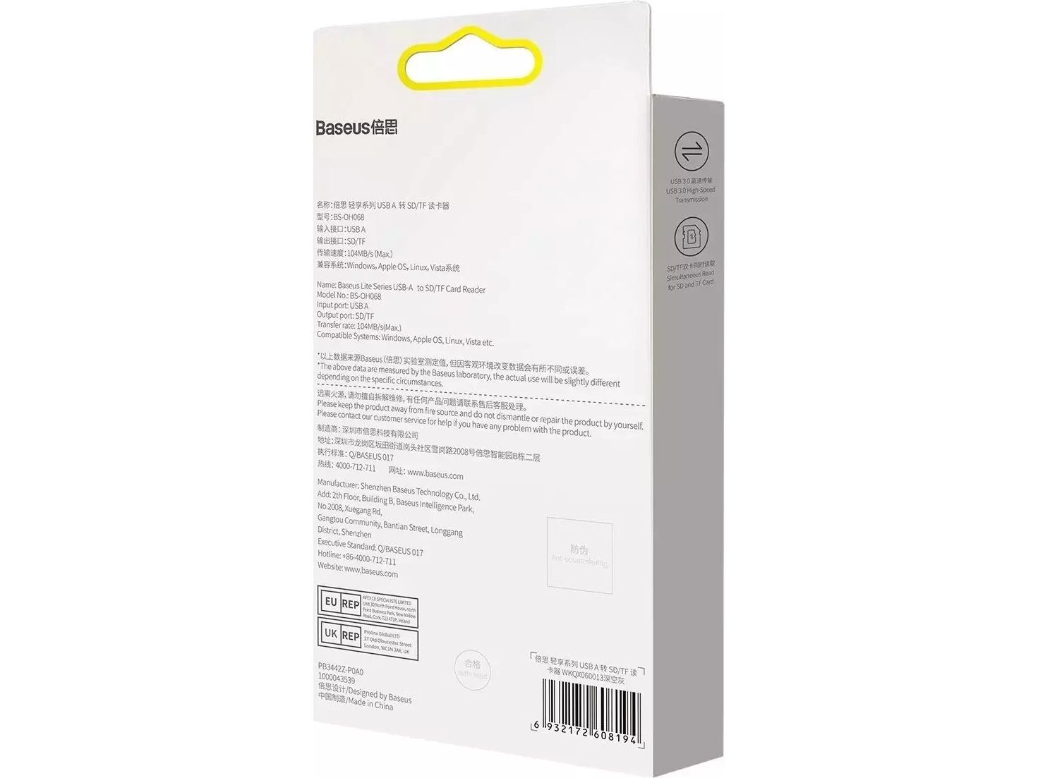 The BASEUS Lite Series BS-OH068 card reader offers versatile support for multiple flash memory types including MultiMediaCard, SD, microSD, and their extended capacities. With its USB 3.0 interface, data transfers can reach speeds of up to 104 Mbps, enhancing productivity and efficiency. The durable aluminum housing protects the device while the dustproof cap ensures cleanliness and longevity. This card reader is designed for convenience and ease of use, featuring Plug-and-Play functionality that allows for seamless connection to various devices. Whether backing up photographs or transferring files, this card reader is an essential tool for anyone seeking reliable data management.