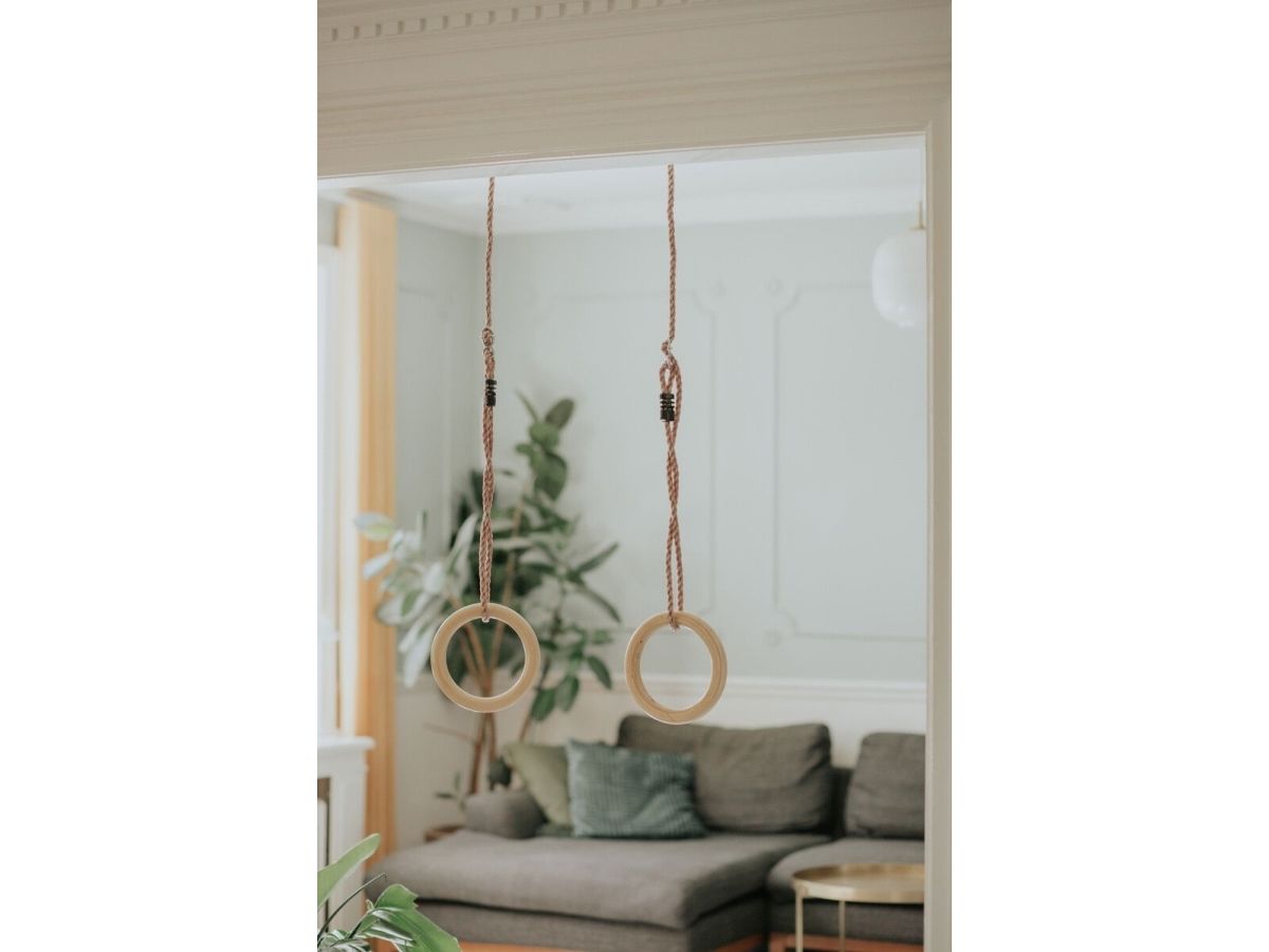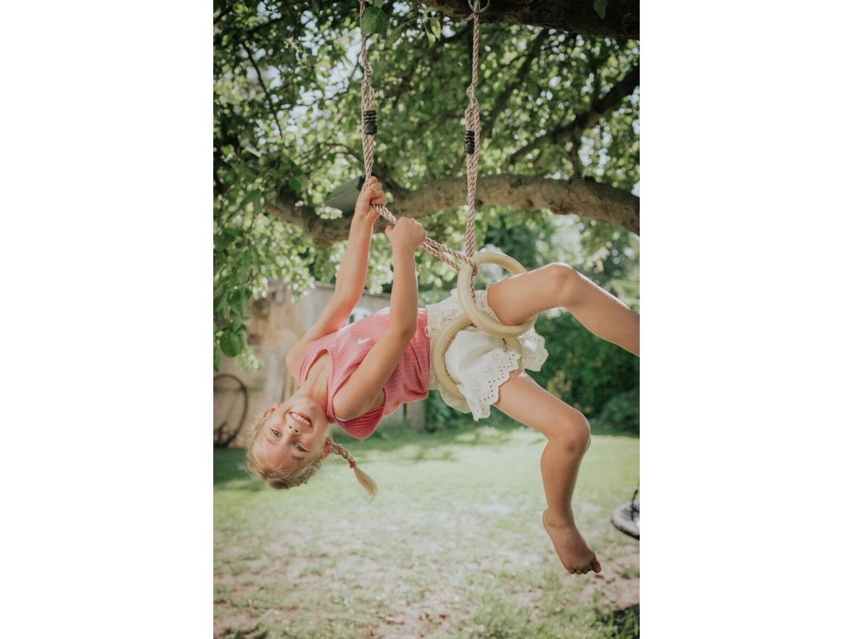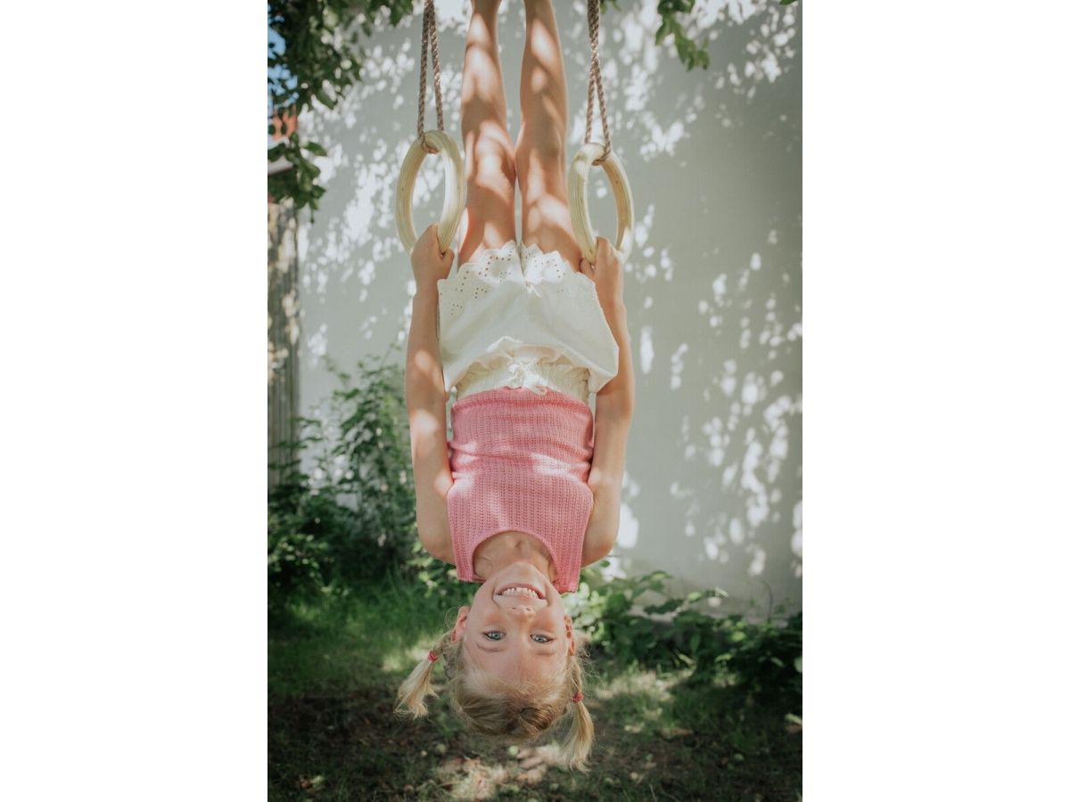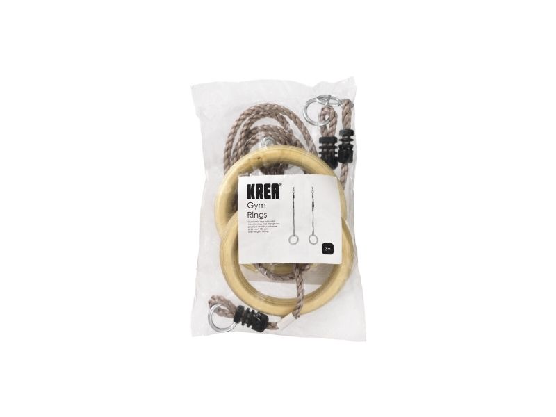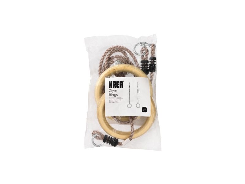 Gymnastikringene har solide ringe i træ og reb i slidstærkt PE, og når børn leger i ringene har de det ikke kun sjovt med at lave seje tricks, legen styrker fx også deres fysik og dermed balance. Ø 28 cm, L 195 cm. Max vægt: 100 kg.