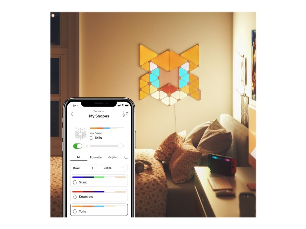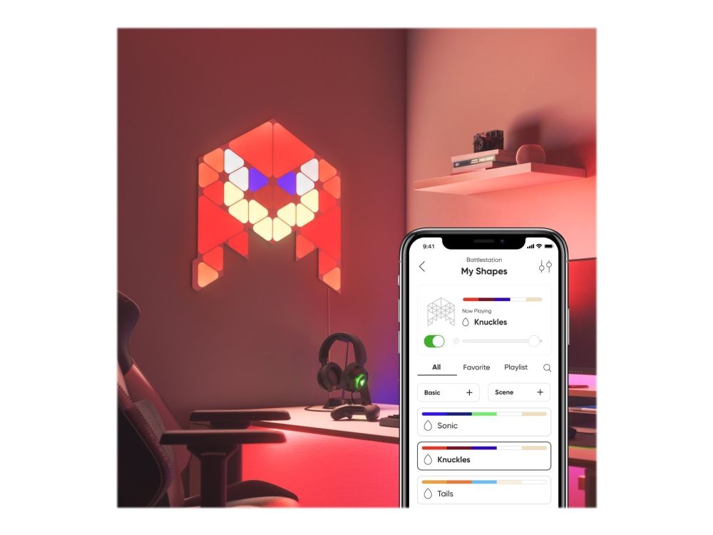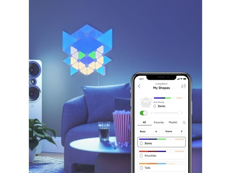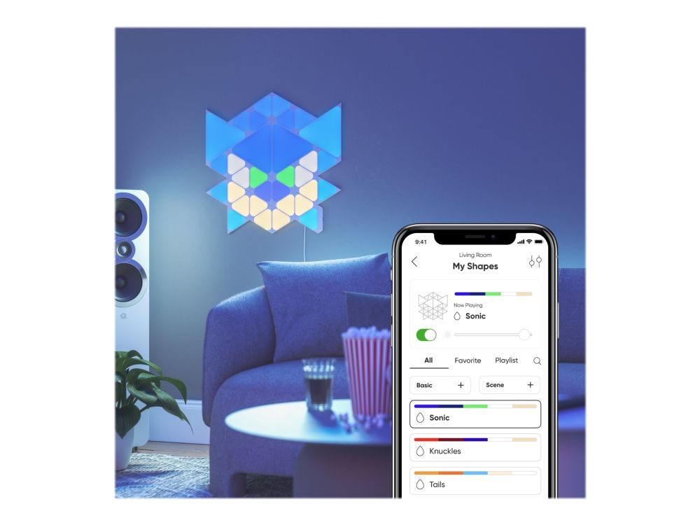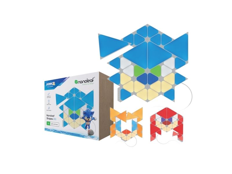 Big stretch, little snack and here you go: the world's favorite blue hedgehog is back for a next-level adventure in Sonic the Hedgehog 2. Bring this little hero in your living room with the Nanoleaf Shapes Starter Kit - Sonic Limited Edition. One Starter Kit to recreate one of the faces of the three main characters of the Sonic the Hedgehog 2 movie: Sonic, Knuckles or Tails. This is a complete kit bundle that that can be arranged into the shape of Sonic, Knuckles or Tails, or your own personalized layout! Modular touch-reactive light panels elevate the concept of smart lighting into a creative journey of design.
