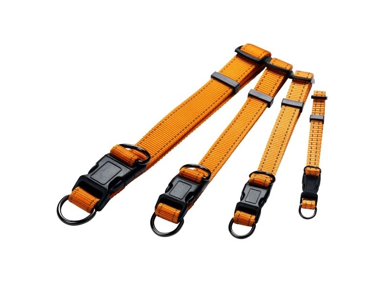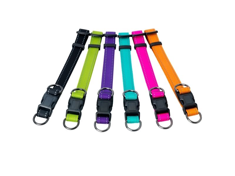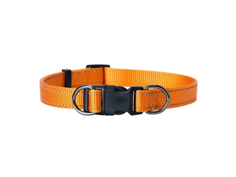 Ställbart reflekterande halsband i nylon. Klickspänne för att enkelt kunna ta av och på halsbandet. Dubbla ringar för ökad säkerhet.