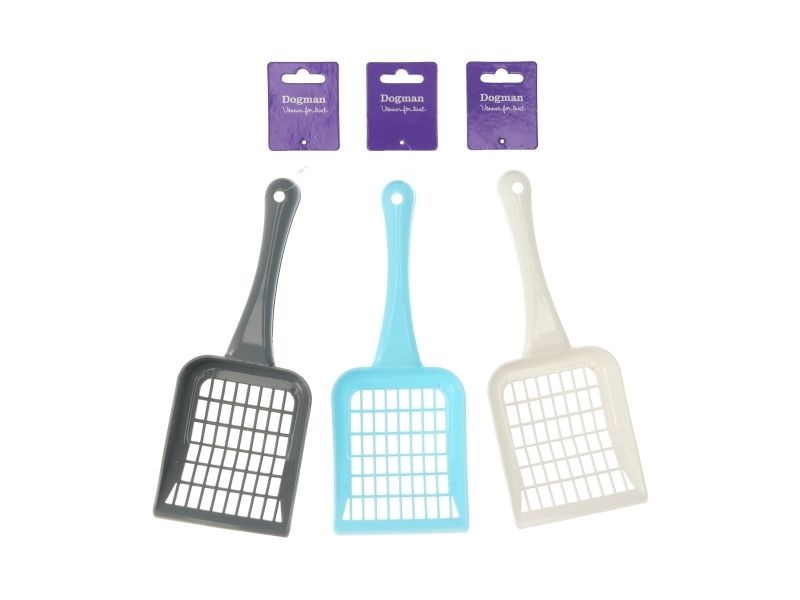 Praktiskt rengöringsspade i plast. För att enkelt rengöra i den stora kattlådan eller smådjursburen. Plocka lätt bort klumparna av urin/avföring i ströet. Levereras i någon av färgerna på bild.