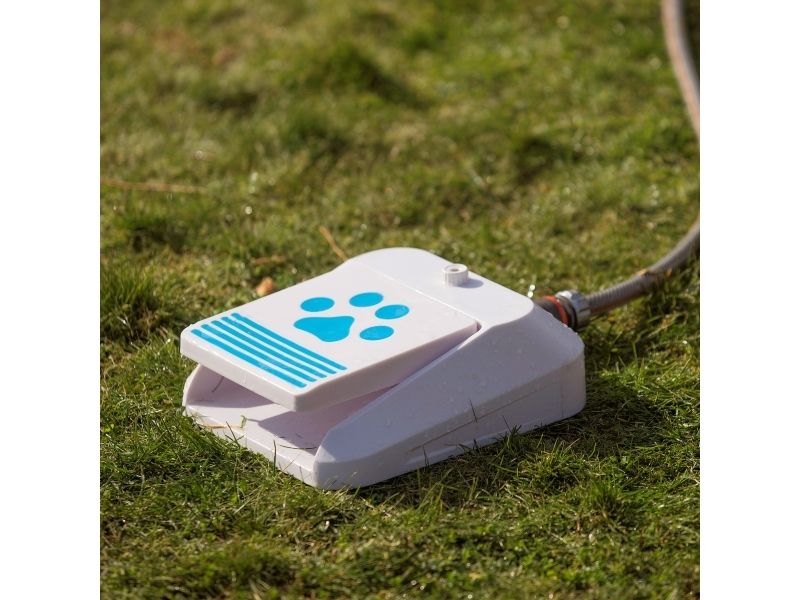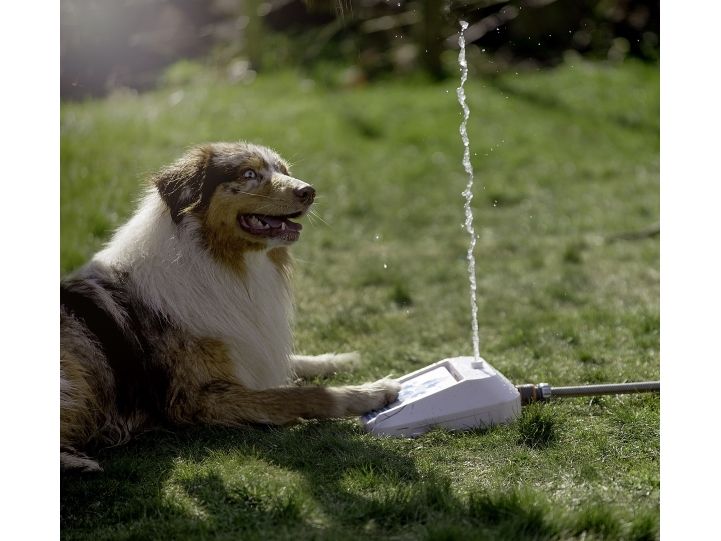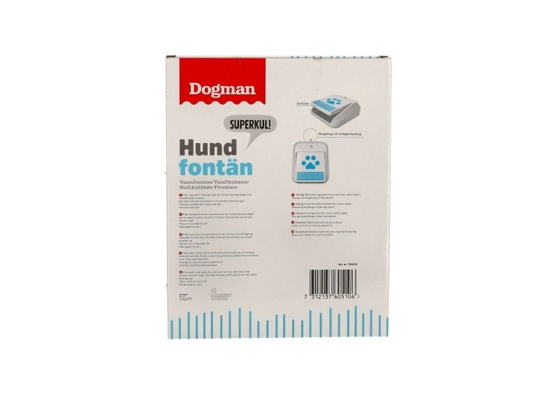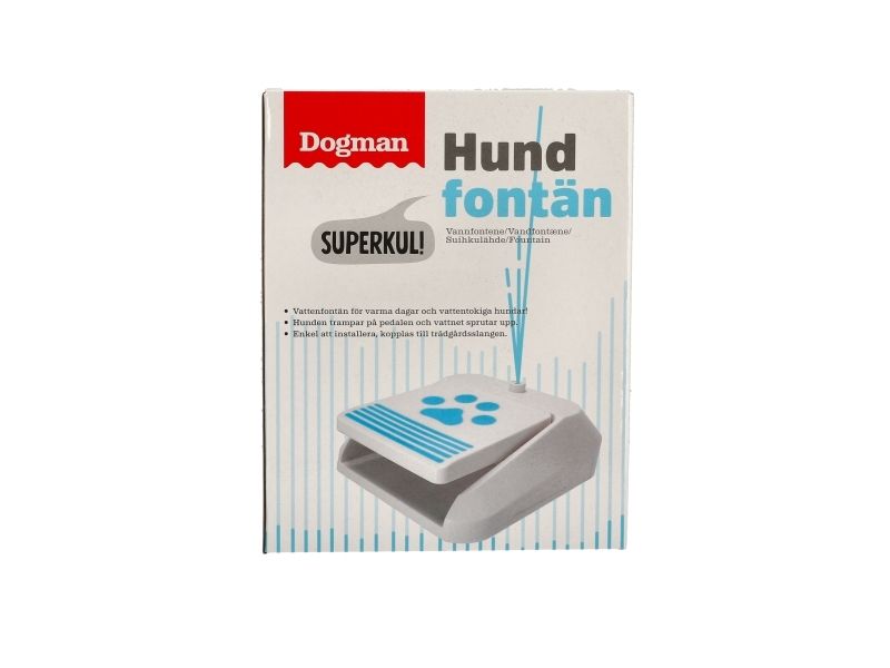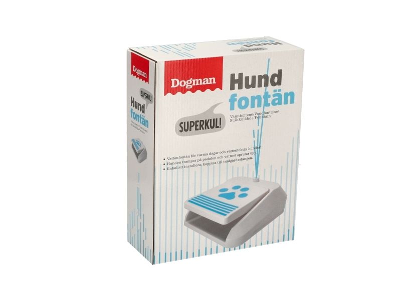 Ett måste för alla vattentokiga hundar! En lekfull vattenfontän, perfekt för varma sommardagar. Hunden trampar på pedalen och vattnet sprutar upp! Endast avsedd för utomhusbruk. Endast avsedd för lek.