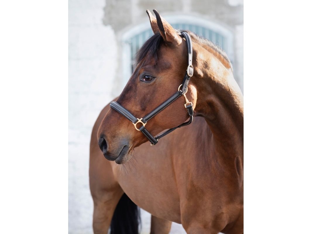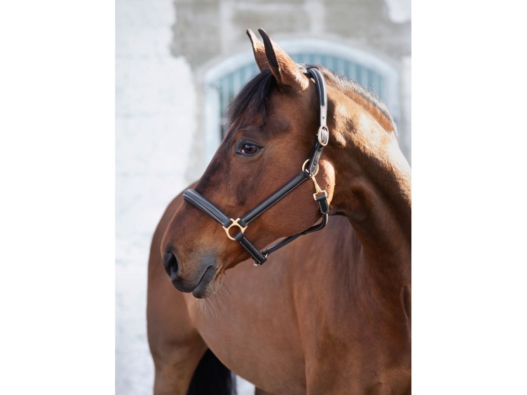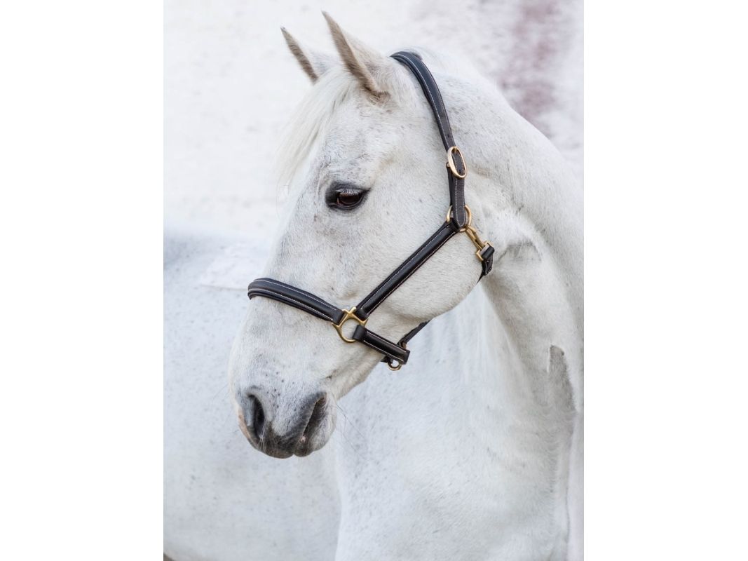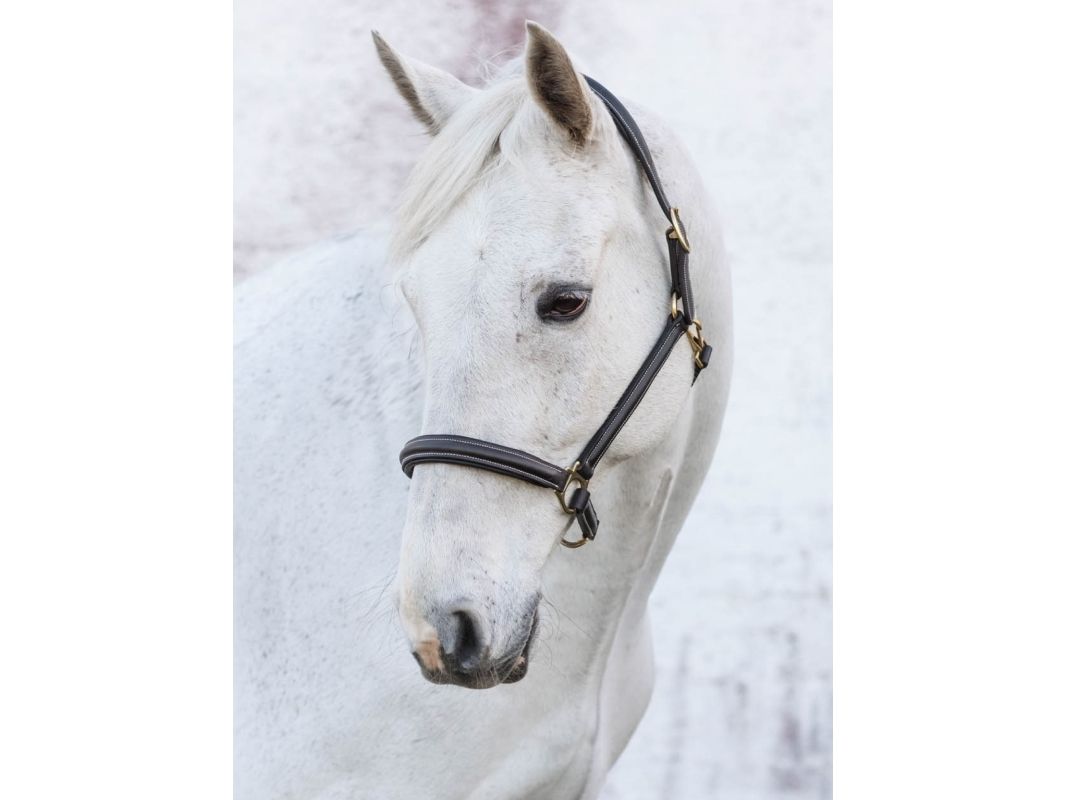 Lädergrimma i mjukt oljat vegetabiliskt garvat läder med foder på nos och nackstycke. Justerbara spännen i mässing på både sidor av nackstycket.