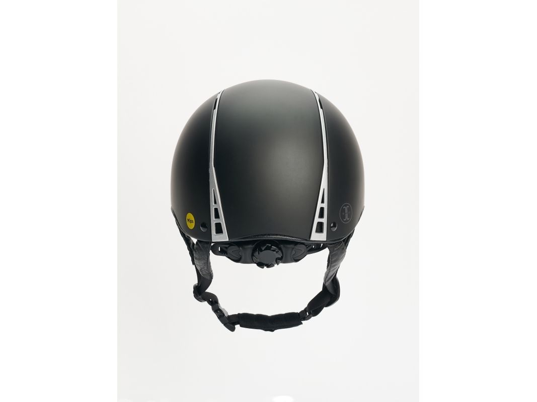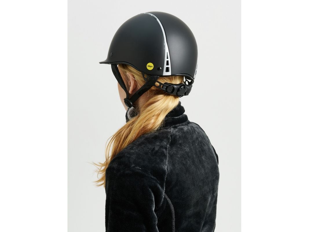 Ridehjelm med MIPS-system for økt sikkerhet. VG1 godkjent. Størrelsen justeres enkelt bak for optimal passform. Hakestroppene er dekket med syntetisk skinn.