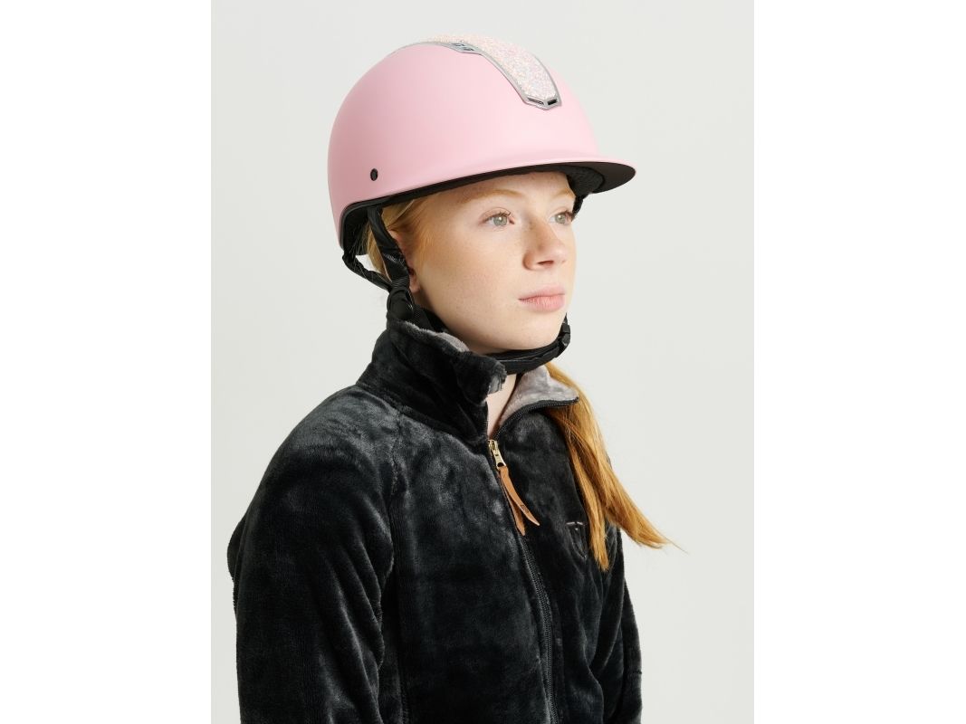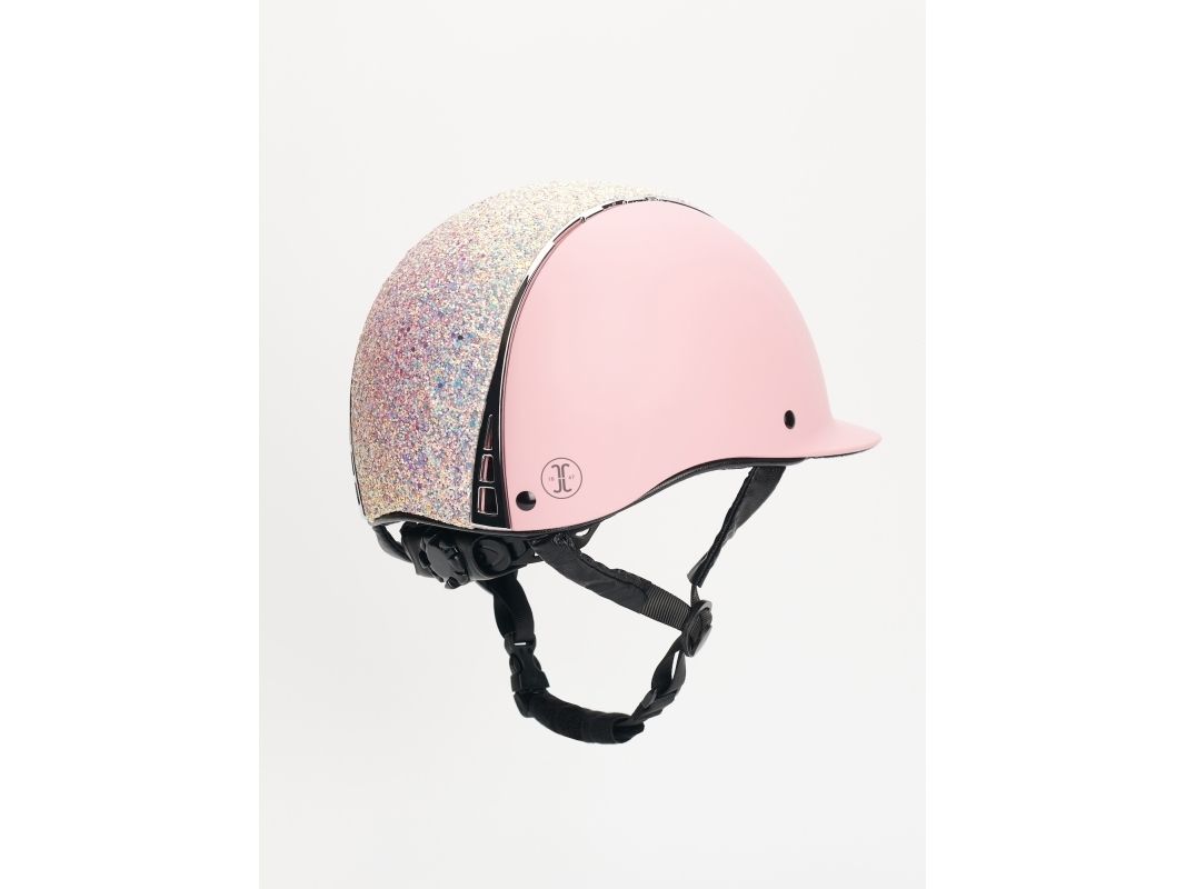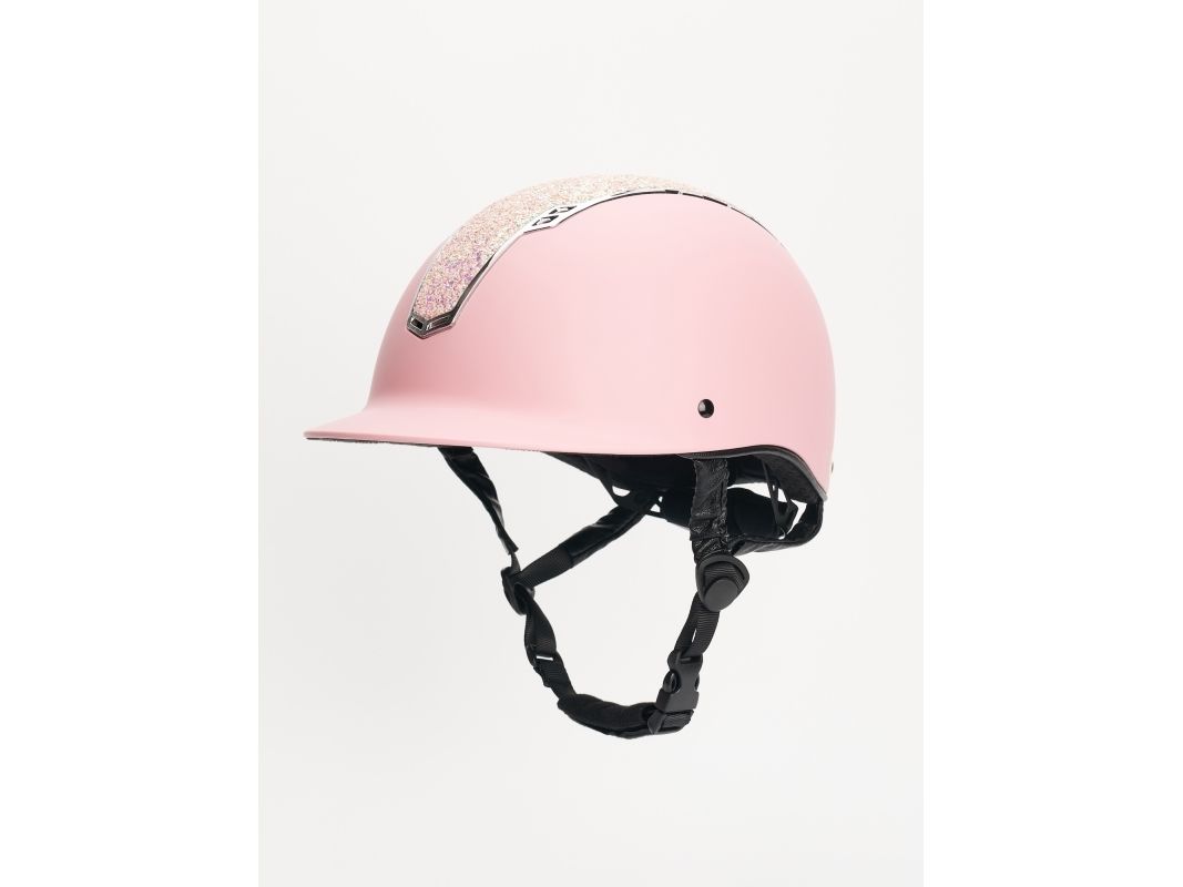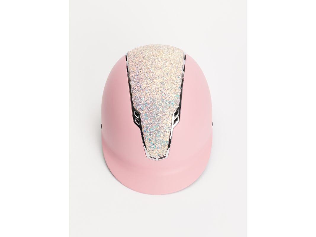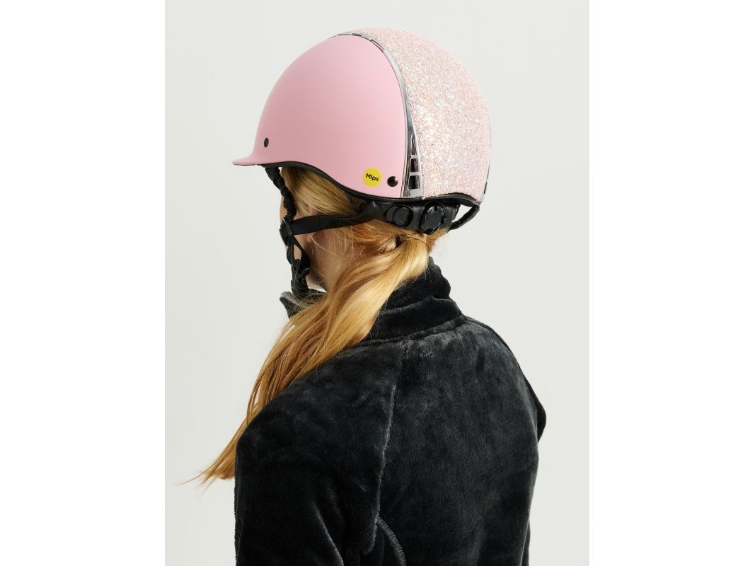 Ridehjelm med MIPS-system for økt sikkerhet. VG1 godkjent. Størrelsen justeres enkelt bak for optimal passform. Store glitterpaljetter. Hakestroppene er dekket med syntetisk skinn.
