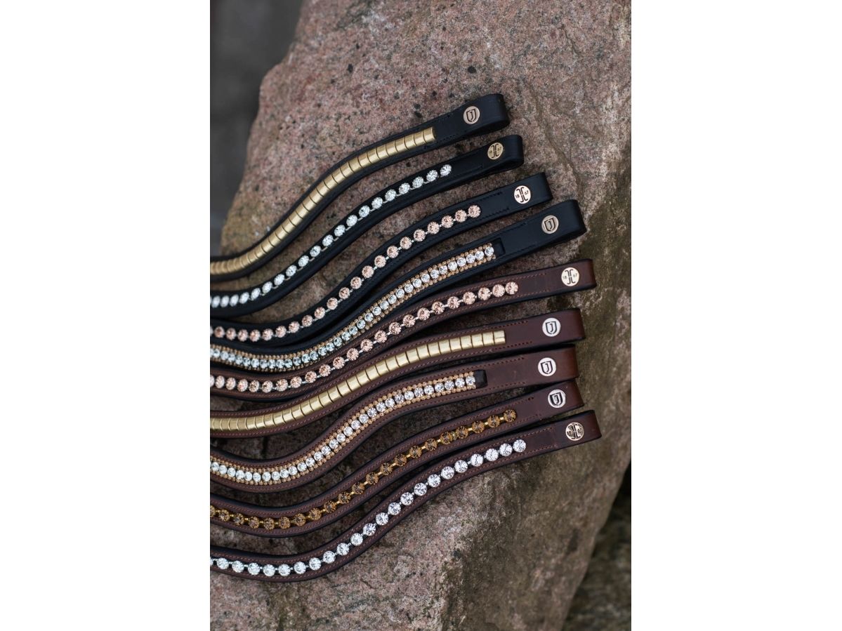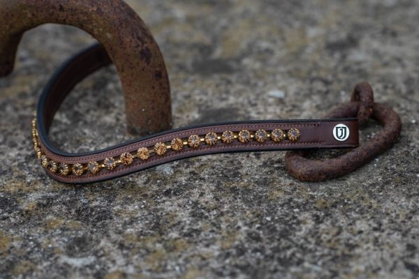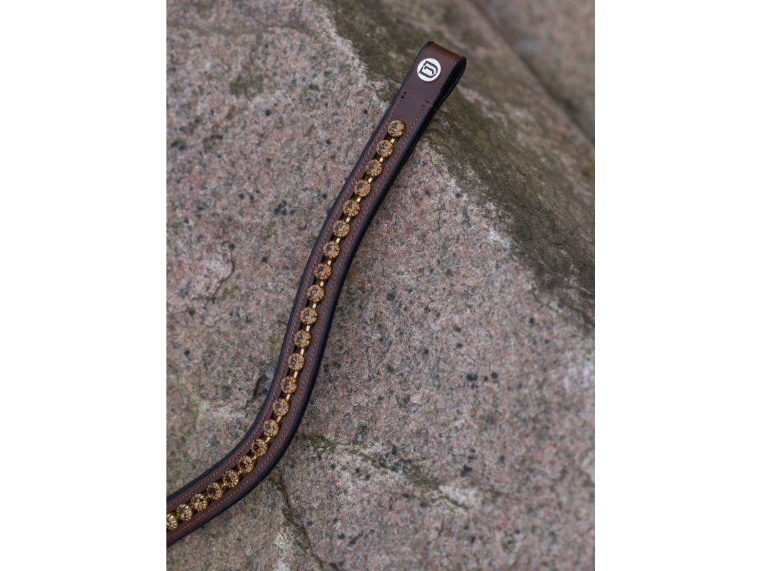 Buet pannebånd i skinn. Store bronsefargede steiner.