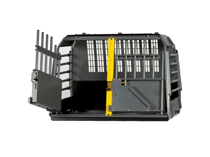 Transportbur til hunde - VarioCage Double Medium (DM) VarioCage hundebur er det rigtige valg til den trafikbevidste hundeejer, som værdsætter sikker transport. Hundeburet er crash testet på SP Technical Research Institute of Sweden i Borås, med deres testmetode SPCT Safe Pet Crate Test. I tilfælde af kollision komprimeres VarioCage således, at kraften fra kollisionen neutraliseres, hvilket betyder, at både dyr og personer i bilen beskyttes mod skader. Denne model er 650 mm høj, hvilket betyder 630 mm indvendig højde, og er egnet til hunde op til 58 cm i højden.