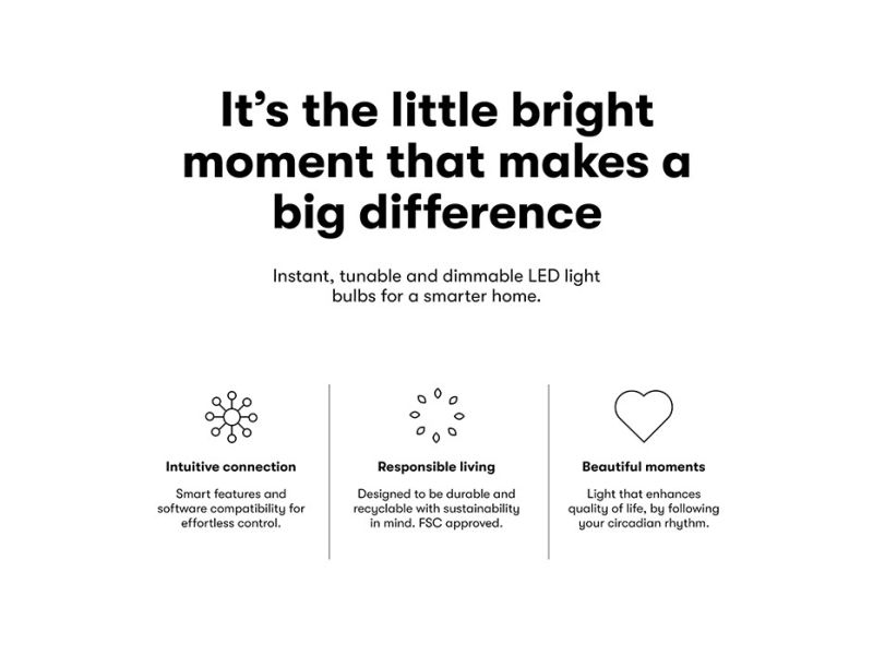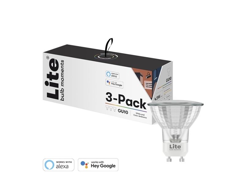 Elevate the ambience of your home with the White & Color Ambience (RGB) GU10 LED bulb from Lite Bulb Moments. This ultra-smart light bulb offers a full spectrum of 64 million colors along with white lighting easily controlled and customized from your device. Effortlessly create the perfect mood for every moment promote your wellbeing and bring color to your everyday life.  Features Circadian Rhythm Technology  Wi-Fi and Bluetooth Connectivity Convenient Dimmable and Timer functions Full control & customization with TUYA Lite App Extensive compatibility with Alexa and Google Home Assistant Circadian Rhythm Technology Designed to enhance your health and wellbeing our smart LED bulb tailors its lighting to sync with your circadian rhythm. By simulating the sun's natural light pattern it ensures you get the right intensity and color of light at the right time contributing to a good night?s sleep and a day filled with energy. Wi-Fi and Bluetooth Connectivity Each light source integrates individually to your Wi-Fi network for secure and quick installation via the Lite app. It can also connect via Bluetooth making it highly versatile and easy to use. Whether you're using a 2.4GHz or 5GHz network setup is simple and hassle-free. Dimmable and Timer functions Experience full control over your lights with the dimmable and timer functions. Easily modify the intensity of illumination to match your mood or time of day and set the timer to automatically turn lights on or off - offering peace of mind and energy efficiency. Full control & customization with TUYA App The TUYA App allows you to create personalized routines and scenes influencing color light settings and brightness to suit your preference instantly. Language is not a barrier as it supports 12 different languages including Nordic ones. Compatible with Alexa and Google Home Assistant This bulb is compatible with Amazon Alexa and Google Home Assistant for seamless voice-controlled operation. Easily integrate the lights into these platforms and manage lighting conditions with simple voice commands giving you a hands-free experience. Setup/ installation The light supports both Wi-Fi and Bluetooth. Supports both 2.4GHz and 5GHz networks. Use the step by step guide in the TUYA app. You can find the TUYA - app in Google Play Store or in Apple App Store. Packaging Contains Three White & Color Ambience (RGB) GU10 LED bulbs Instruction Manual Product Specifications Socket: GU10  Power: 4.5W  Color Temperature: 2700-6500K Full RGB color scale (64 million colors) Supports both 2.4GHz and 5GHz networks Compatible with TUYA Google Home Assistant Amazon Alexa Application supported: TUYA app available in Google Play Store and Apple App Store - Lite Bulb Moments retail packaging (FSC approved)