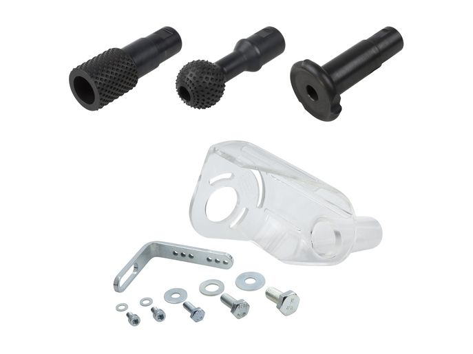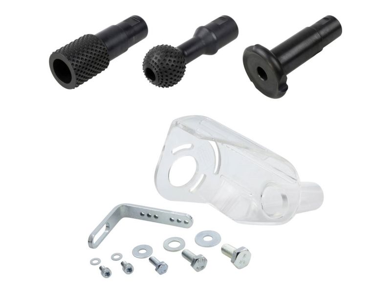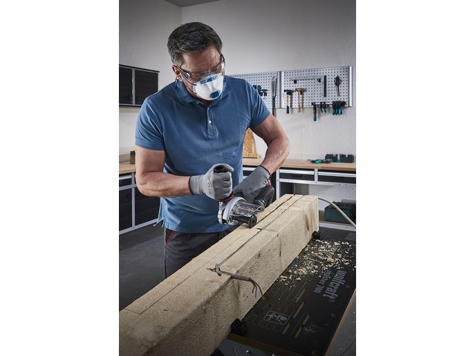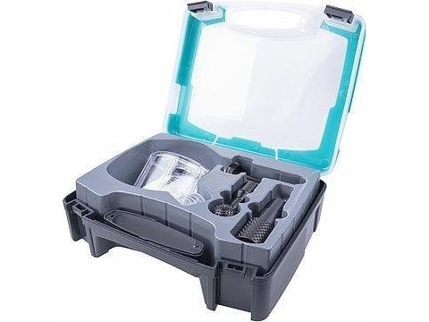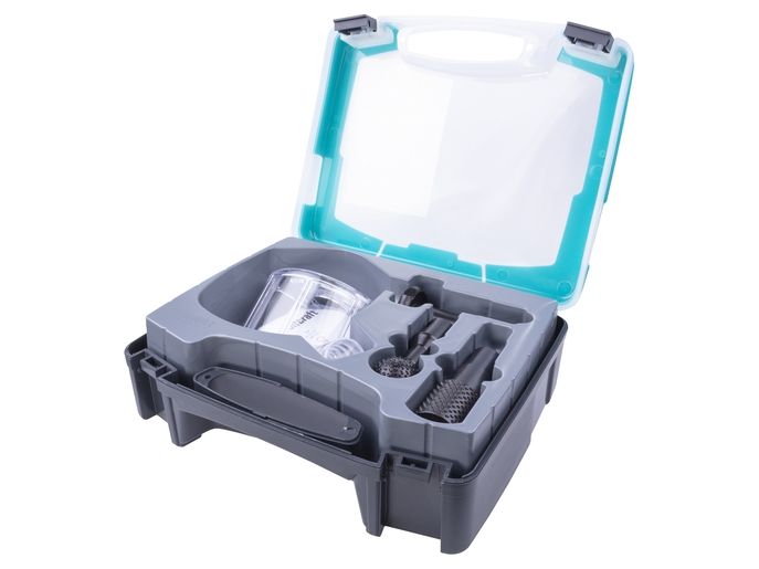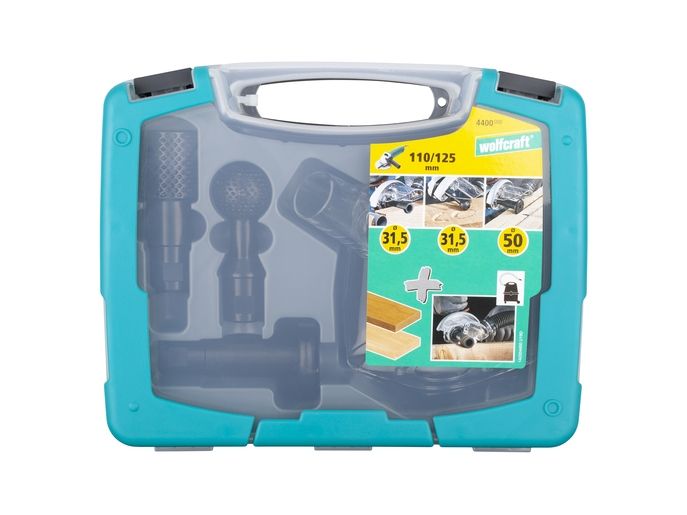 Træbearbejdningssæt til vinkelsliber, 4 dele. 4-delt træbearbejdningssæt til vinkelsliberen er ideal for sikker og støvbar bearbejdning af blødt og hårdt træ. Det indeholder en cylinderraspe med en diameter på 31,5 mm til at raspe huller, skrabe overflademateriale såsom bark eller afrunde kanter, en kuglerraspel med en diameter på 31,5 mm til at raspe huller og en fræseskive med en diameter på 50 mm til fræsning af slidser til trækning af kabler Til at rive kanter, hulle lommer ud samt til bearbejdning af plane, konkave og konvekse flader. Alle værktøjer består af robust C45-stål og har et M14-gevind, så de er kompatible med gængse vinkelslibere med en diameter på 115/125 mm. For at sikre den bedst mulige arbejdssikkerhed skal den medfølgende udsugningsskærm af transparent, slagfast plast altid anvendes ved alle værktøjer. Til opsugning af træstøv kan du tilslutte enhver almindelig støvsuger med en slangediameter på 29-32 mm. For en ordentlig opbevaring og sikker transport skal du opbevare værktøjet i den tilhørende plastkuffert med 2 komponenter.