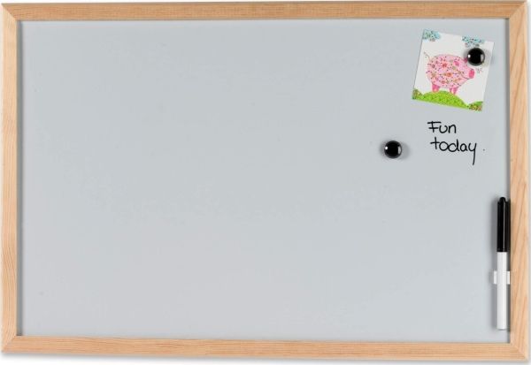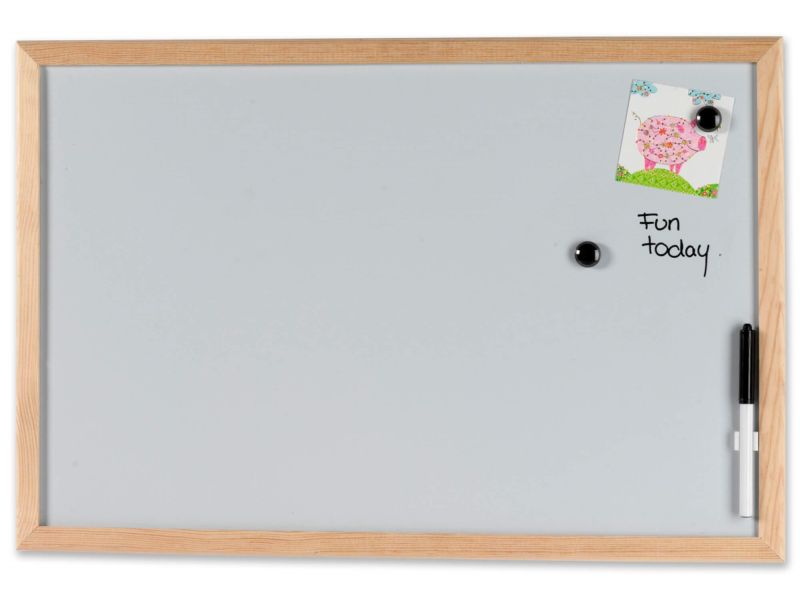 Magnetisk whiteboardtavle med fyrtræsramme. Let at skrive på med en marker.
