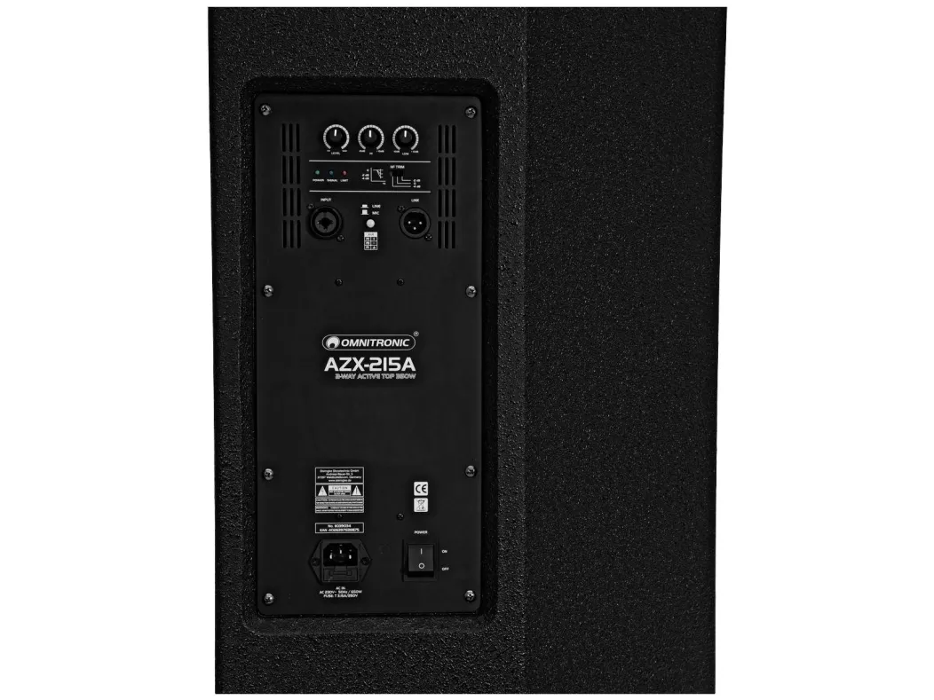 Omnitronic AZX-215A 2-vejs top aktiv 350W Boldsikkert metalgitter med akustisk skummaterialeDobbeltflange med 0° og 5° hældningsvinkel muliggør en fleksibel justeringM10-gevindindsatser til hængende monteringKan anvendes stående, som skærm, på basboks, stativ eller flyvende1 robust bæregreb Aktiv boks med 15-woofer, 1,75-titandriver, LF 300 W RMS, HF 50 W RMS