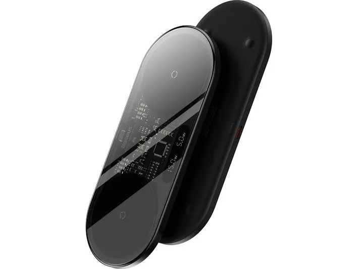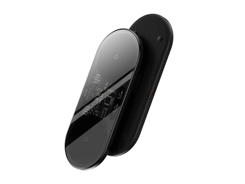 The charger has a transparent panel, which gives it a futuristic feel and interestingly exposes the inside of the product. A practical screen that displays charging power in real time is also a plus. The silicone pad ensures a stable position of the charger, in addition, thanks to its lightweight design and thickness of 7 mm you can easily store it in your backpack.
