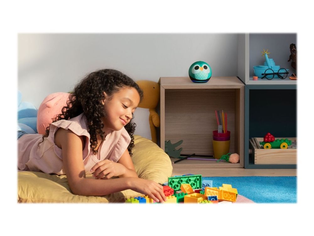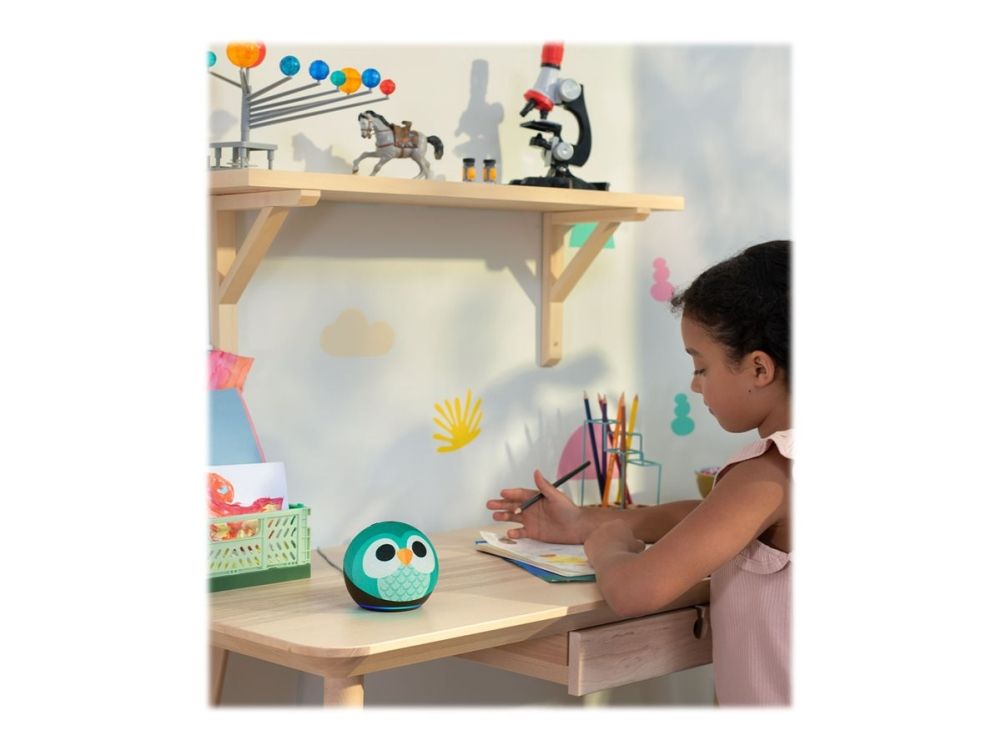 Meet Echo Dot Kids - Amazon's popular and cutest smart speaker with Alexa. The fun design features an improved speaker, delivering clear vocals and vibrant sound. Kids can ask Alexa for homework help, to play music, read bedtime stories, and more.