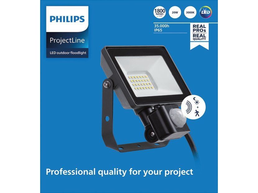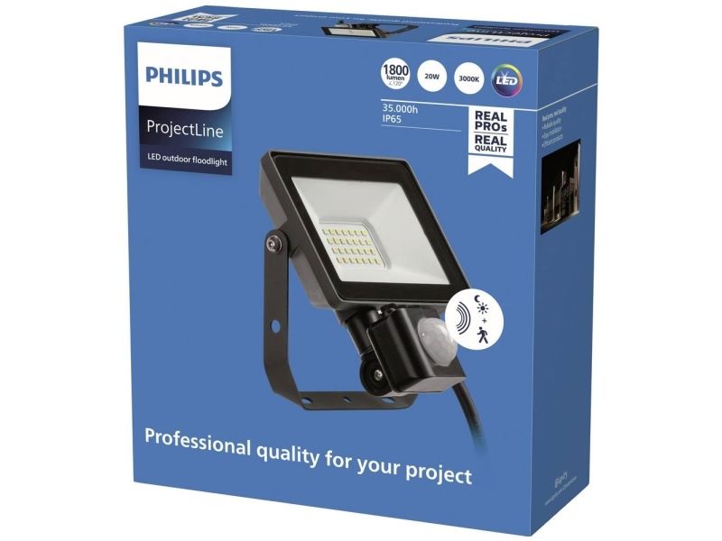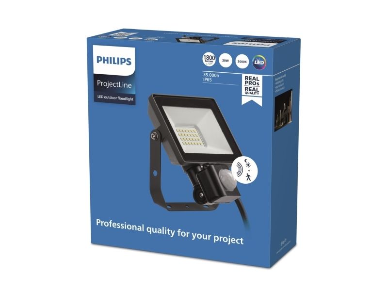 Philips Floodlight. Product colour: Black, International Protection (IP) code: IP65, Housing material: Metal. Total power: 20 W, Bulb technology: LED, Colour temperature: 3000 K. Package width: 17.4 mm, Package depth: 14.3 mm, Package height: 6.2 mm