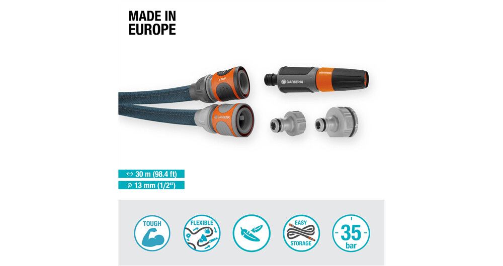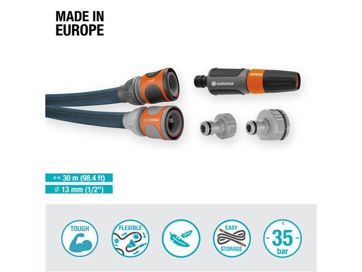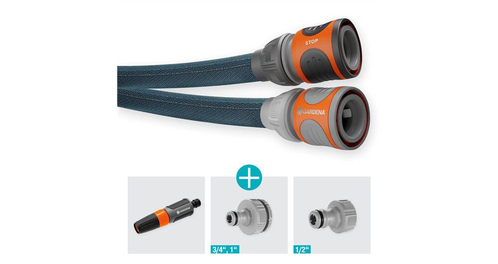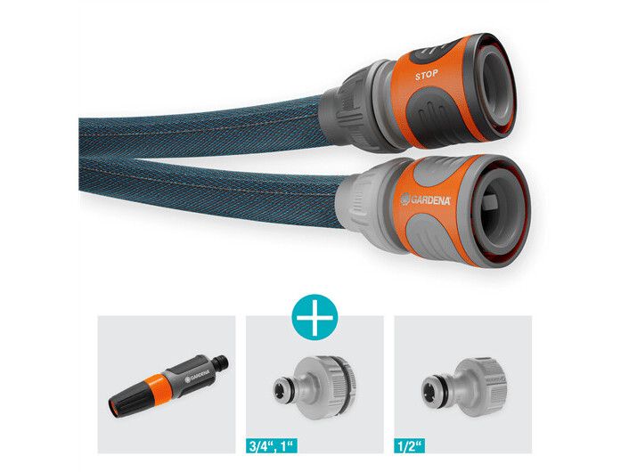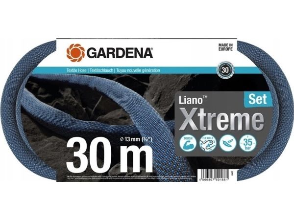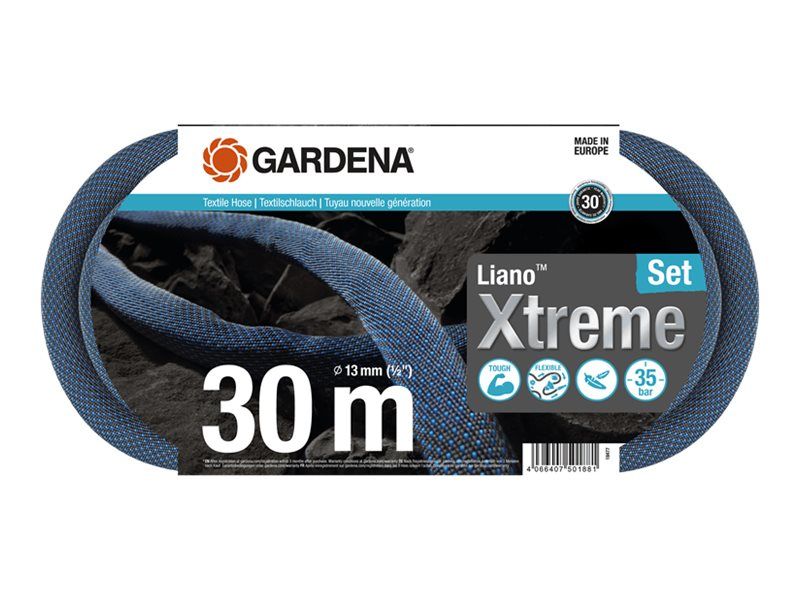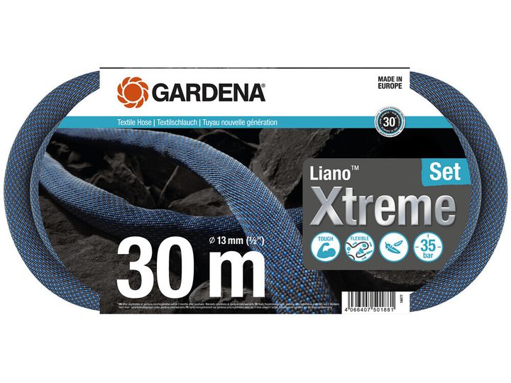 For long and demanding irrigation in your large garden, the Textile Hose Liano Xtreme 30 m Set from Gardena is ideal. The ready-to-use set includes the 30 m long Liano Xtreme with a diameter of 13 mm (1/2"), the pre-assembled Original Gardena System parts Liano Hose Connector and Liano Water Stop, two Tap Connectors and a Cleaning Nozzle. One of the two tap connectors has an integrated reducing joint so that you can connect the textile hose to a total of three tap sizes. The tough Liano Xtreme impresses with a very flexible PVC inner hose and the innovative outer hose made of extremely resistant textile fabric. This combination ensures excellent performance, flexibility and durability. The garden hose is tough as well as dirt-repellent, so it is ready for any challenge. You can easily maneuvre the Liano Xtreme because it won't kink or get stuck on obstacles. The textile hose masters rough terrain such as cobblestones, rose thorns or pulling along house walls. Thanks to its good feel, it lies comfortably in the hand. In addition, the Liano Xtreme is up to 50 % lighter than conventional PVC hoses. This is an advantage especially in a large garden and for longer irrigation sessions. Thanks to its elasticity, you can store the textile hose in a space-saving way on the shelf or in the garage, as it adapts to the available storage space. The burst pressure of the hose is 35 bar. Thanks to UV and frost protection, the Liano Xtreme can be used all year round, regardless of the weather. In addition, it is free of harmful substances and thus free of phthalates (< 0.1%) as well as cadmium, lead and barium (< 0.1%).