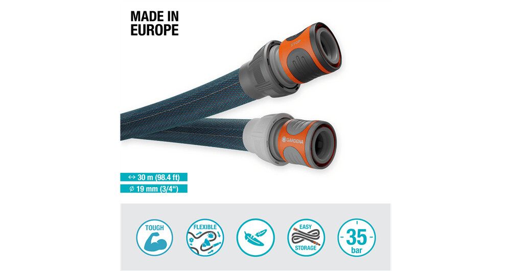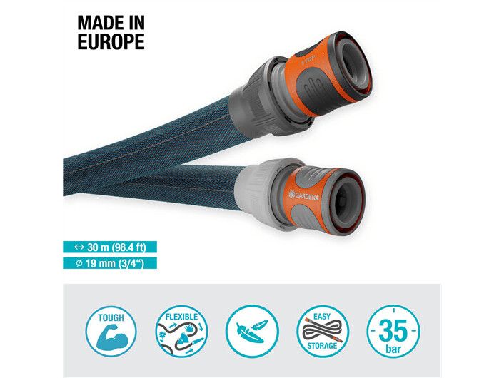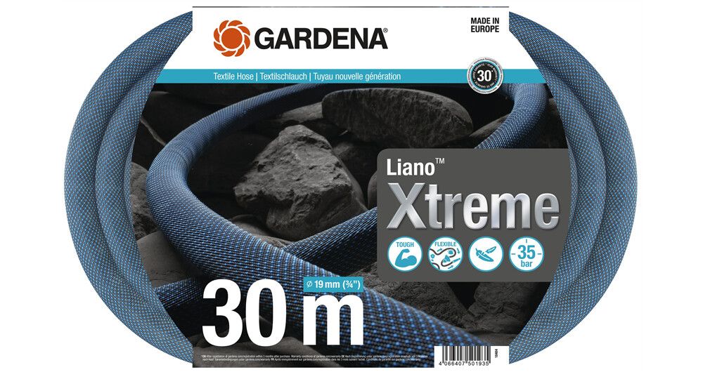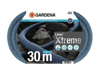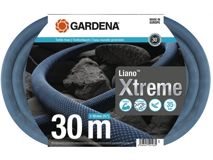 The Textile Hose Liano Xtreme 19 mm (3/4") 30 m by Gardena provides optimal support if you want to transport a lot of water quickly. It is ideal for long, tough and challenging irrigation. The larger diameter of 19 mm (3/4") ensures a high water flow rate. Use the Liano Xtreme with sprinklers or pumps, for example. Thanks to the pre-mounted Original Gardena System parts Liano Hose Connector and Liano Water Stop, the tough water hose is quickly ready for use. You'll be impressed by the high performance, flexibility and durability of the hose. The Liano Xtreme gets these properties from its very flexible PVC inner hose and the innovative and dirt-repellent outer hose made of extremely resistant textile fabric. This allows you to move it without resistance through rough terrain such as cobblestones, rose thorns or along the house wall. It does not kink and can be easily guided around obstacles. The Liano Xtreme feels comfortable in your hand thanks to its non-slip feel. You can irrigate your garden comfortably over a longer period of time because the textile hose is up to 50% lighter than conventional PVC hoses. After gardening, the flexibility helps you to compactly store the textile hose. It easily adapts to the available storage space on the shelf or in the garage. It has a burst pressure of 35 bar and is UV and frost resistant, which makes it suitable for use all year round. The textile hose is free of harmful substances and therefore free of phthalates (< 0.1%) as well as cadmium, lead and barium (< 0.1%).